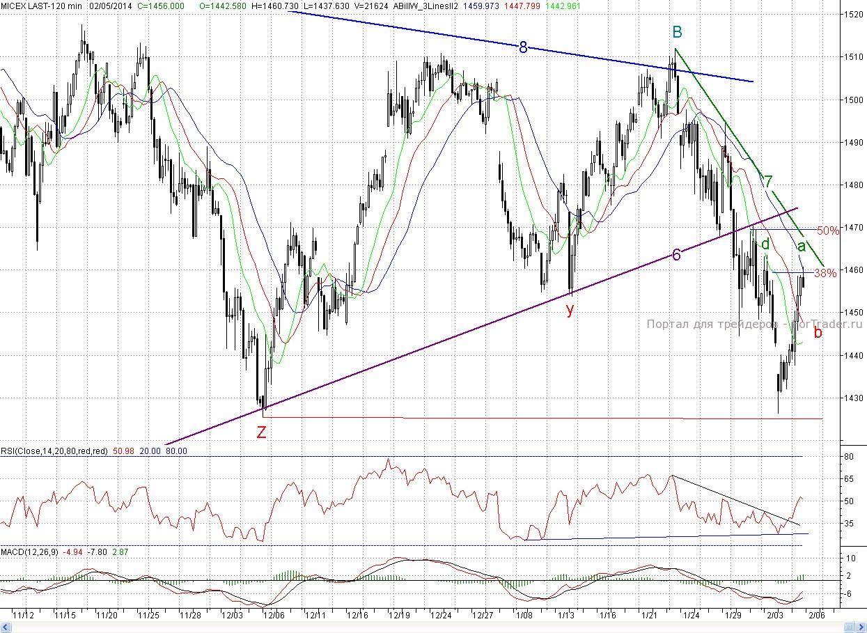 Исследуя 2-часовой график индекса ММВБ видим, что, открывшись с небольшим гэпом вверх, дальнейшего роста практически не последовало. Однако ближе к обеду бычьи настроения стали преобладать, чему в основном способствовало существенное укрепление рубля, и котировки дружно пошли в гору. В результате цены достигли уровня 38% коррекции (~1 459 п.) от падения с 23 января и закрытие произошло в хорошем плюсе (1,03%). А индекс РТС прибавил почти 2%.