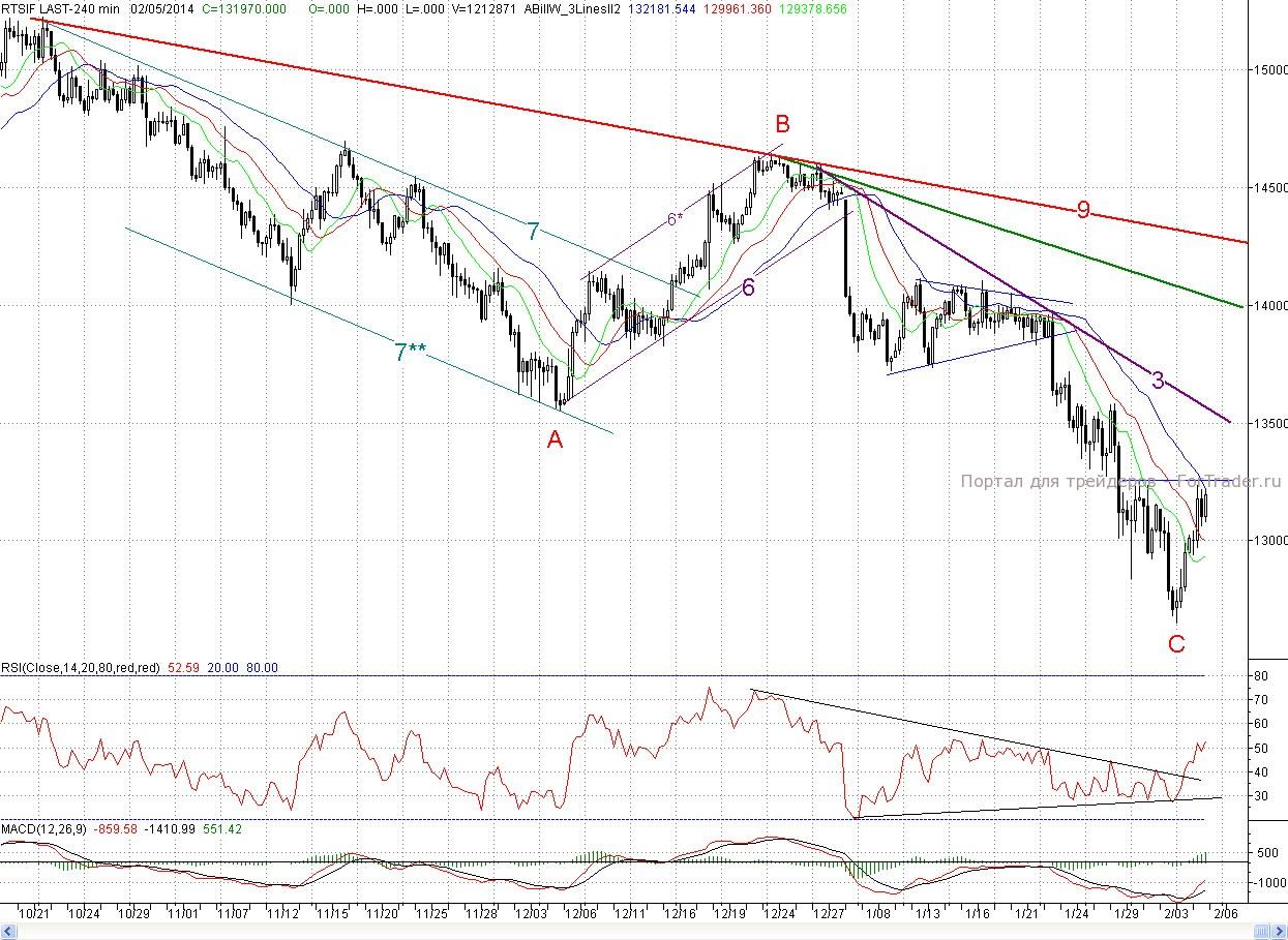 Таким образом, покупатели продолжили контрнаступление. И весь вопрос заключается в том, на сколько у них хватит сил еще приподнять котировки. Полагаю, что они на исходе, и вот по каким причинам. Во — первых вчерашние объемы торгов уменьшились по сравнению с предыдущим днем. Во вторых заходная растущая волна (a-b) еще не сформирована. Поэтому дальнейший рост под большим вопросом. К тому же фьючерс на индекс РТС за два дня показал уже самый большой отскок в этом году, и с графической точки зрения прорисовал значительную часть фигуры «перевернутая голова- плечи» Так что ожидаю возобновления снижения, по крайней мере в рамках формирования вышеназванной модели. А для этого мишкам желательно удержать предыдущий локальный максимум (132 600п.), или не дать его намного преодолеть.