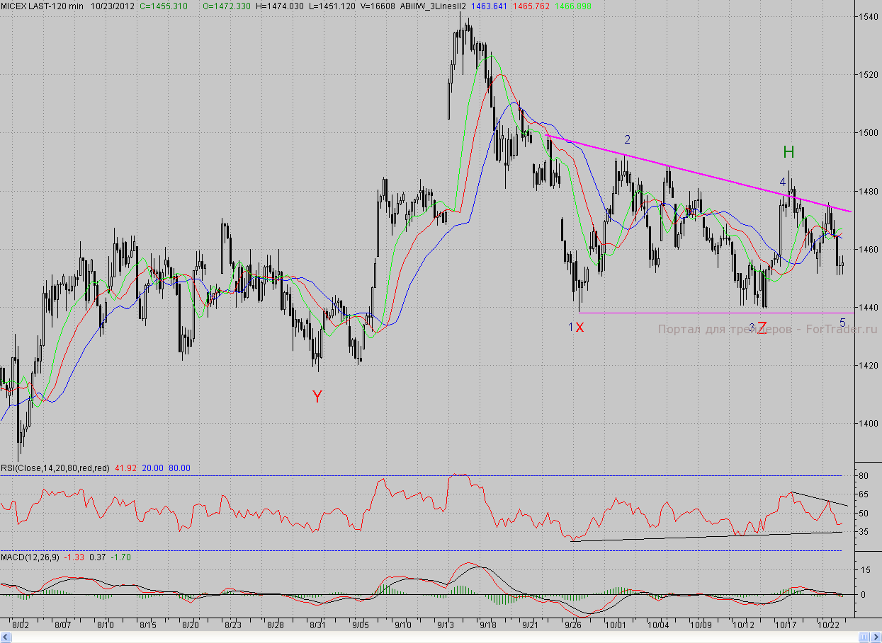 Исследуя 2-часовой график индекса ММВБ, видим, что открывшись с небольшим гэпом вниз, котировки попытались возобновить рост предыдущего дня. Но на слабом внешнем фоне сил у «быков» хватило только на то, чтобы прикрыть утреннее окошко и ещё раз протестировать ближайшее сопротивление в лице верхней грани «треугольника». А стоило мировым площадкам начать чихать, как российские «медведи» пошли в уверенную контратаку и уже к обеду продавили цены до минимума понедельника (1451,6 п.). Здесь «бурые» решили взять перекур, и в итоге вся оставшаяся сессия прошла в боковике, закрывшись на минимуме.
