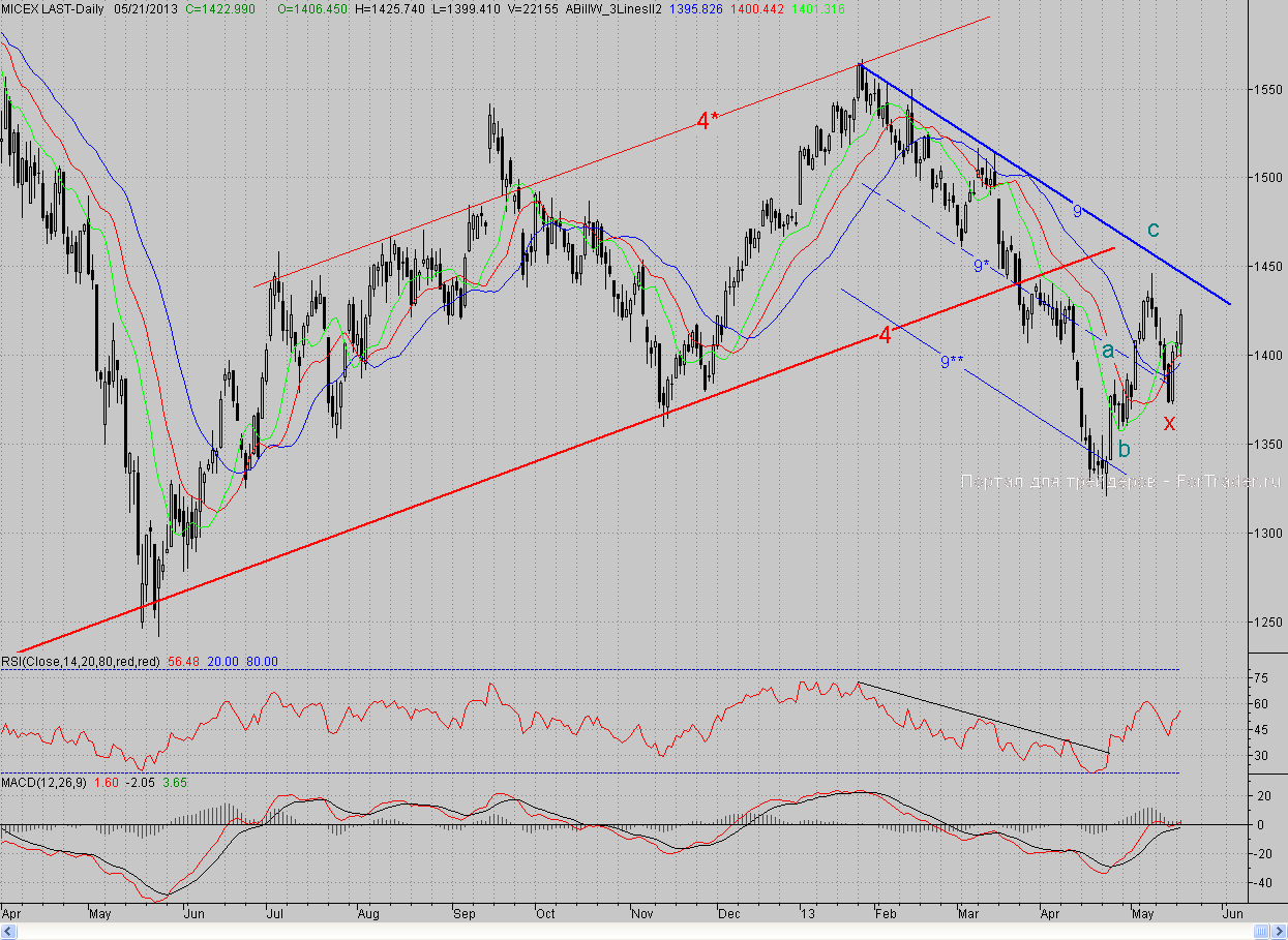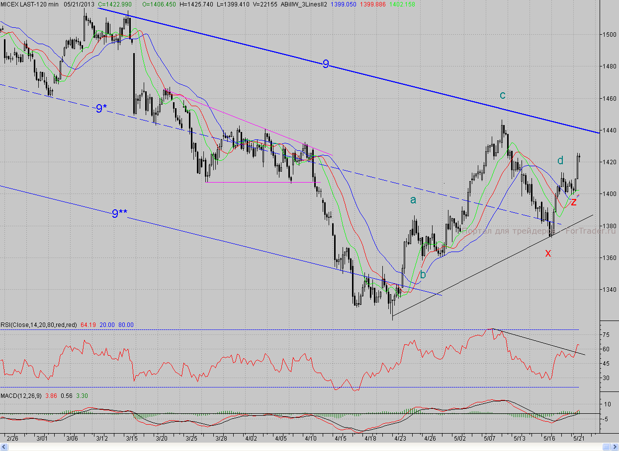Исследуя 2-часовой график индекса ММВБ, видим, что открывшись на тех же уровнях, «медведи» попытались продавить цены вниз. Однако ближайшая поддержка в лице минимума понедельника справилась со своей ролью, и котировки всю первую половину торгов в целом толкались в боковике. «Быки» не решались возобновлять наступление, а «медведи» не собирались перехватывать инициативу. Но ближе к 4 часам дня на фоне начавших подрастать фьючерсов на американские индексы покупатели всё же собрались с силами и перешли к решительным действиям, уверенно преодолев не только максимум понедельника d (1413,4 п.), но и уровень 62%-ной коррекции от снижения с 10 мая (~1417 п.). На этом покупатели решили остановиться, и до ключевого сопротивления в лице среднесрочного падающего тренда (9) и предыдущего локального максимума «с» (1446,3 п.) цены не дошли.