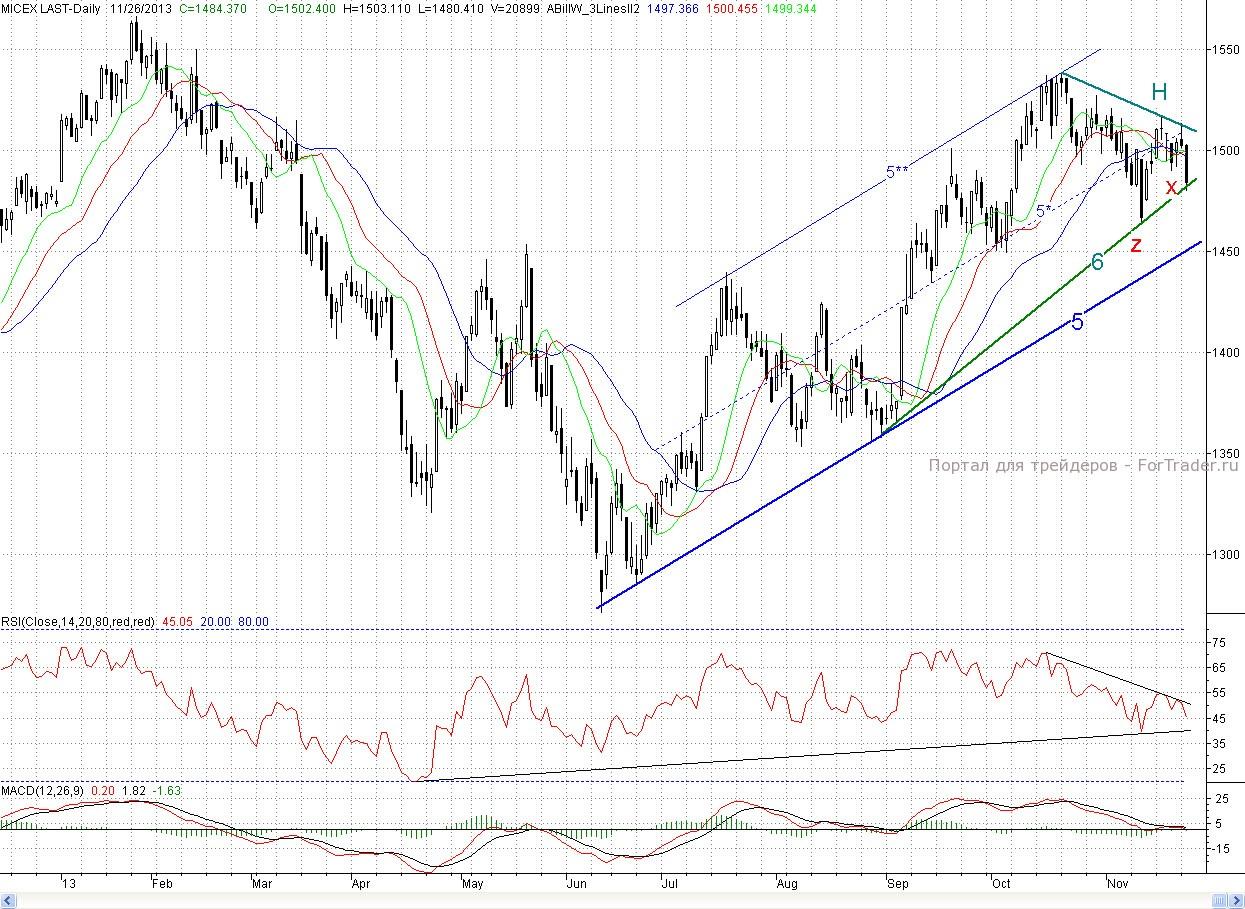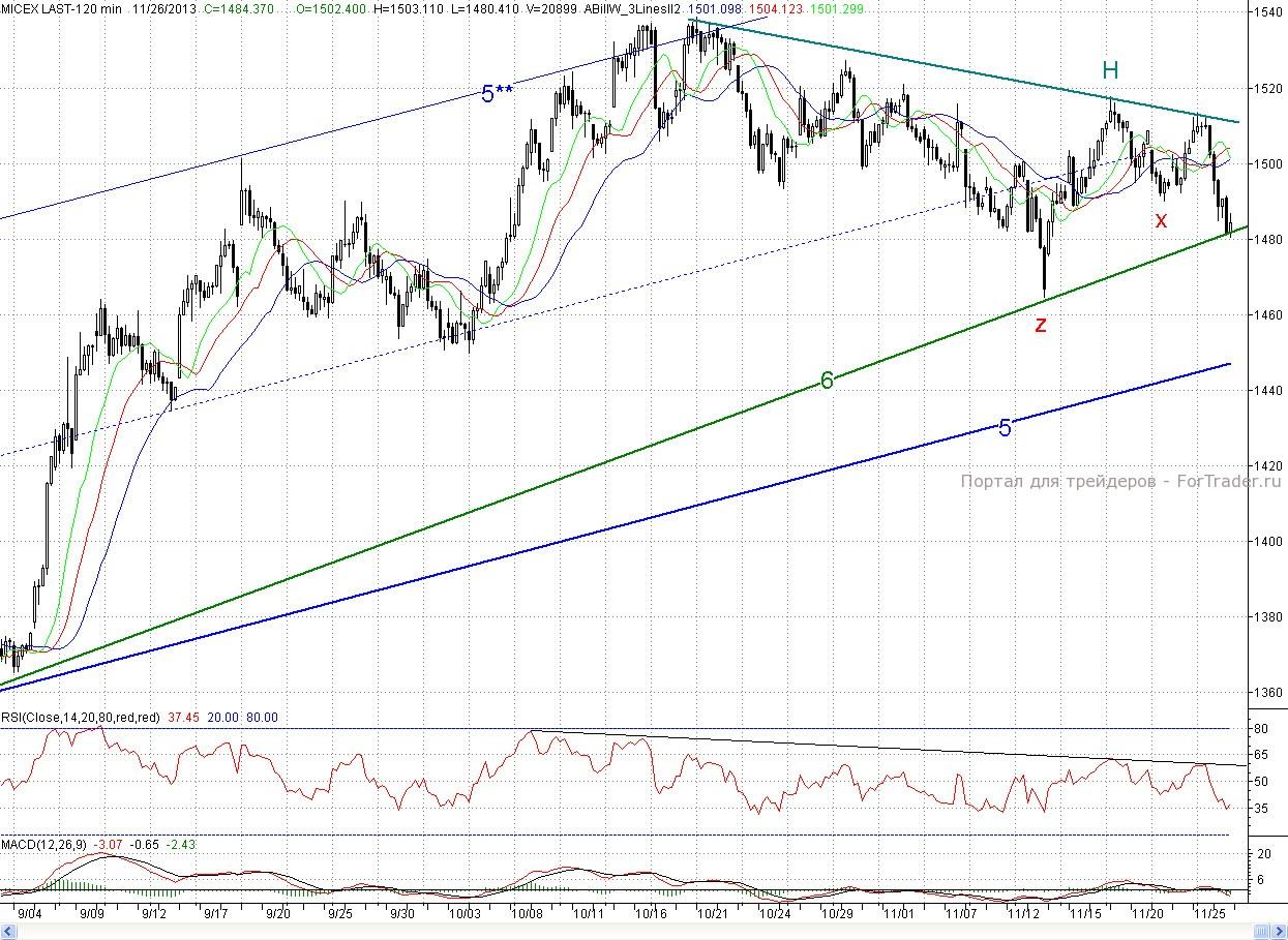 Таким образом, покупатели в понедельник не сумели переломить ситуацию в свою пользу, а во вторник существенно усугубили свое положение. Ведь как мы писали вчера, со сдачей дневного фрактала на продажу Х (1 489,98 п.) снижение с начала ноября возобновится. И целью его будет нижняя граница среднесрочного растущего канала (5-5**). Сейчас она проходит в районе 1450п. Пока же котировки встретили поддержку на среднесрочном растущем тренде (6), начинающимся с начала сентября. Негативным моментом для покупателей было и то, что объемы торгов на падении существенно возросли. Так что ворота на мясокомбинат, на вчерашнее утро только приоткрывшиеся, теперь распахнуты☺.