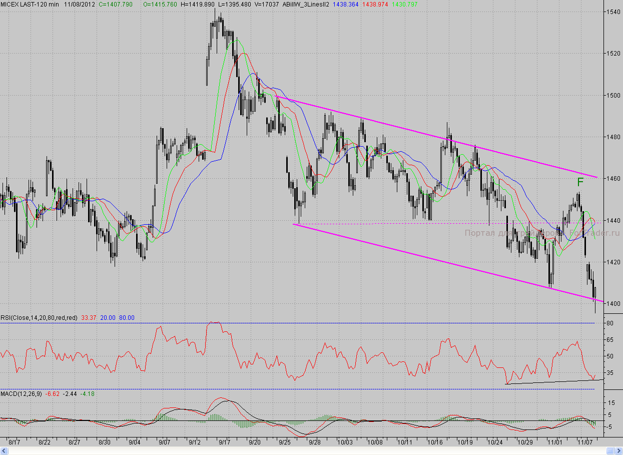 Исследуя 2-часовой график индекса ММВБ, видим, что на негативном внешнем фоне котировки открылись с гэпом вниз и продолжили падение, начатое днём ранее. Как и ожидалось, на предыдущем локальным минимуме (1407,5 п.) цены нащупали поддержку, и «быки» частично отыграли утренние потери. Однако «медвежьи» настроения превалировали, и стоило фьючерсам на американские индексы только чихнуть, как цены снова оказались на утренних минимумах. А ближе к вечеру «бурые» и вовсе возобновили атаку и преодолели не только предыдущий локальный минимум, но и нижнюю границу падающего канала. Правда, под самый занавес произошёл отскок, и котировки вернулись на эту нижнюю грань, однако в целом закрытие дня оставило желать для покупателей лучшего.