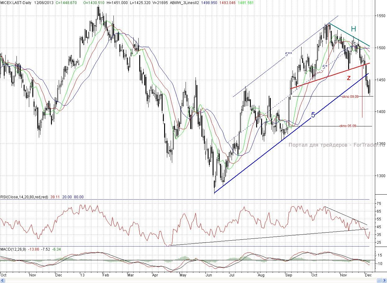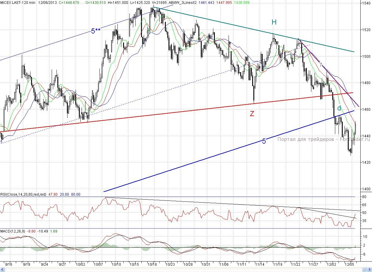 Таким образом, покупатели, наконец-то с третьей попытки смогли организовать контратаку. Тем не менее, хотя день и завершился на оптимистичной ноте, но вот неделя закрылась довольно негативно для них – черной свечой, и нижняя тень ее не такая длинная, чтобы говорить о сломе понижающей тенденции. К тому же индекс ММВБ по Б. Уильямсу вышел из покупки, где он был 3 месяца (закрытие ниже зубов аллигатора). Минимальная цель падения ~1 390 п.(высота исполняющейся фигуры «голова-плечи) не достигнута Бычьих дивергенций за исключением гистограммного MACDа на 2 — часах не образовалось, так что цены будут ниже. Правда расхождения присутствуют на более мелких интервалах, что предусматривает дальнейшее формирование отскока. В этом случае ближайшим сопротивлением выступит кластерная зона, в которой расположен предыдущий локальный максимум d (1 455.81п.) и проходят нижняя граница среднесрочного растущего канала (5-5**) (подтяжка к ней снизу) и краткосрочный падающий тренд (7). Более сильным редутом будет пробитая линия шеи. Но и про оборону покупателям необходимо помнить. Роль ближайшей поддержки сыграет утреннее окно, а далее пятничный послеобеденный минимум (~1 433 п.) и дневной (1 425,32 п.)