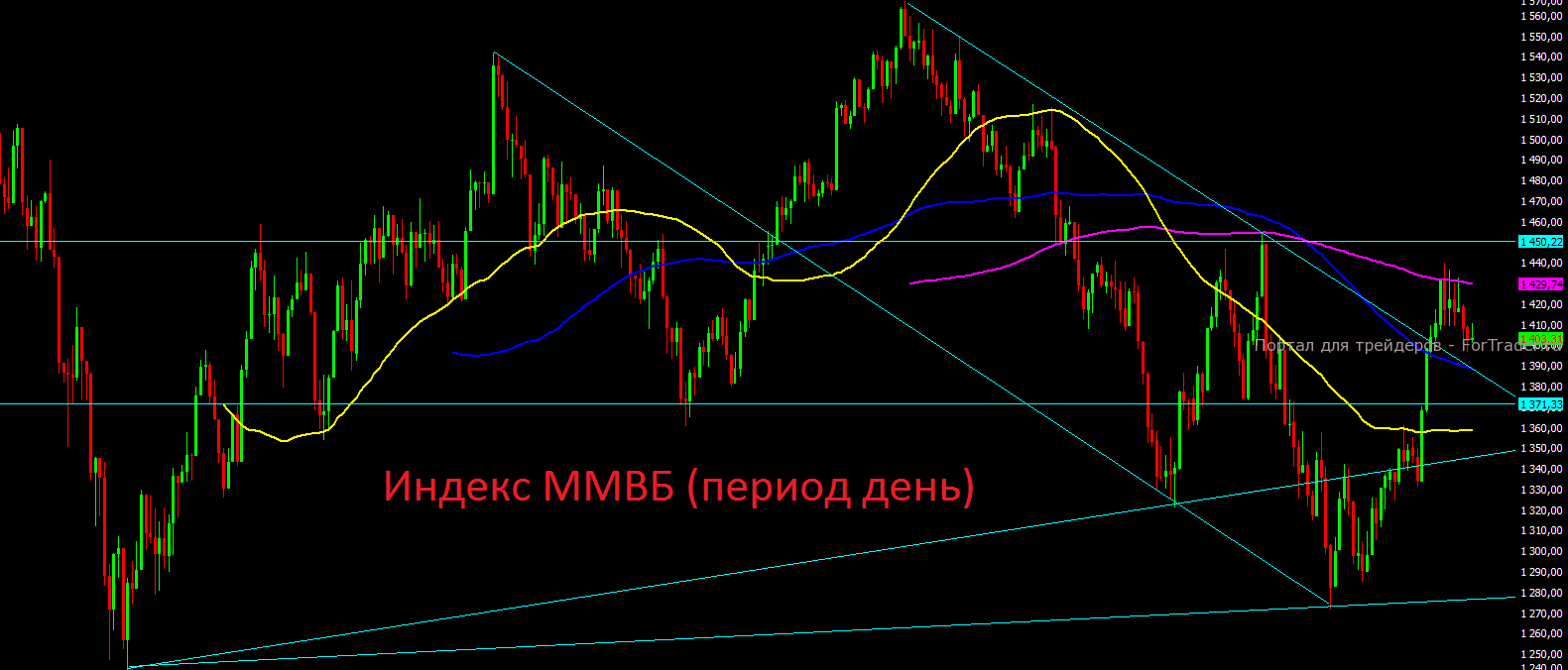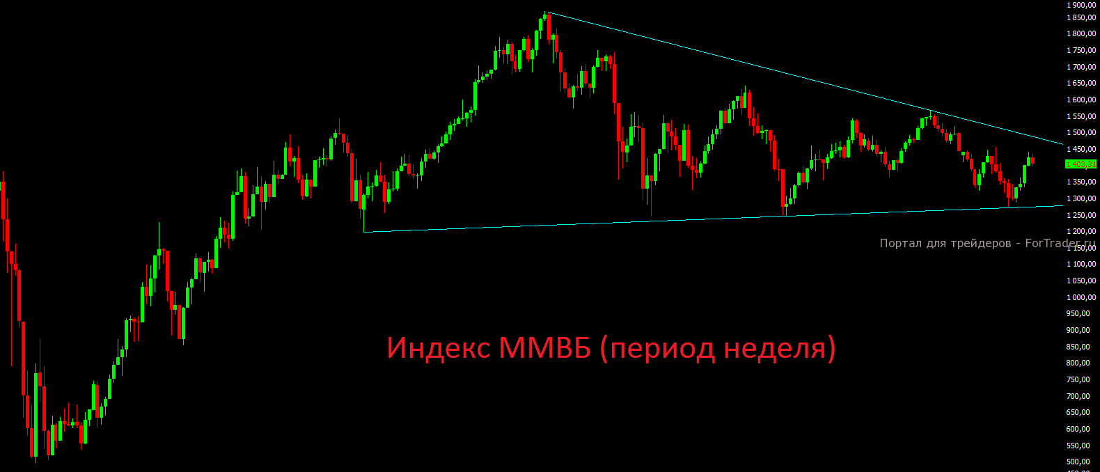 С технической точки зрения закрытие прошлой недели дало нам нейтральный знак. Российскому индексу ММВБ не удалось обновить минимумы предыдущей недели и удалось удержать отметку 1400 пунктов. Пока по-прежнему остаются шансы на тест отметки 1450 пунктов в качестве сопротивления, тем более, что осталось до неё всего 3%. На дневном графике индекс также снял свою локальную перекупленность и возможно мы скоро вновь увидим очередной тест 200-дневной скользящей средней на отметке 1430 пунктов. Долгосрочных позиций на текущих уровнях мы открывать всё же не рекомендуем, а вот спекулятивно можно пробовать делать ставки на рост. Многое всё же прояснится только в среду вечером.
