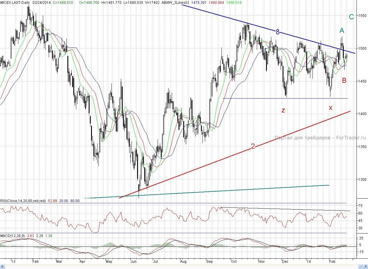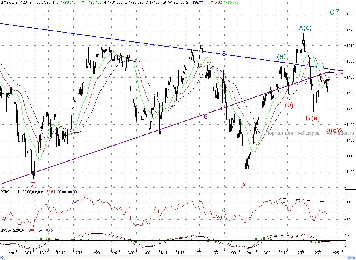 Таким образом, медведи не сумели развить наступление второй половины пятницы и ситуация практически не изменилась. По прежнему рост с 20 февраля можно классифицировать как формирование заходной падающей волны ((а)- (b)). В этом случае снижение с прошлого вторника должно продолжится. При этом медведям нельзя пускать цены выше уровня 62% коррекции (~1 498 п.) и тренда (8). Ближайшим же сопротивлением выступит пятничный максимум b (1 492,33п.) Однако снижение с начала прошлой недели вписывается в формирование растущей волны (A — B) большего порядка. Но чтобы этот сценарий реализовался для начала покупателям необходимо уверенно преодолеть вышеназванный уровень 62% коррекции (~1 498 п.) и тренд (8). А затем и максимум волны А (1 518,12 п.).