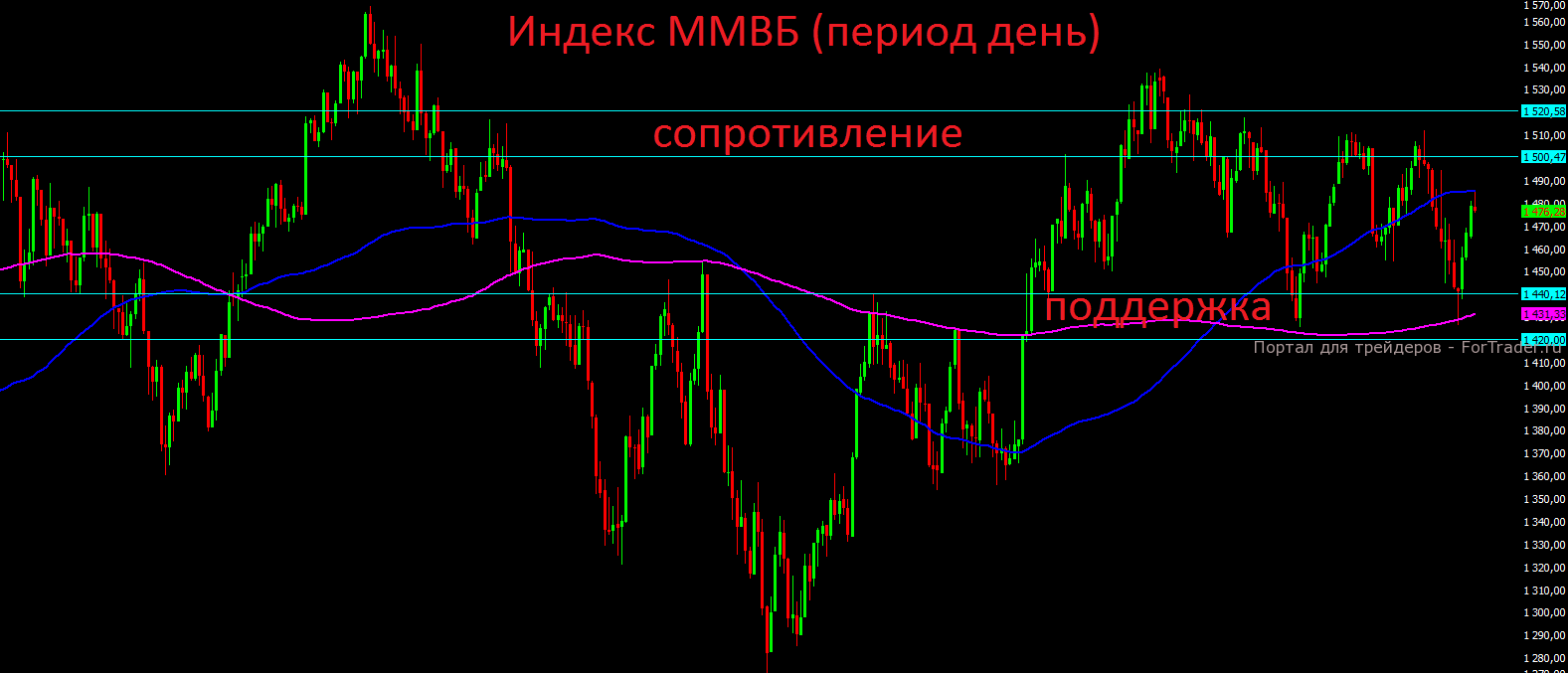 Российский индекс ММВБ пока ещё сохраняет шансы на штурм сильного сопротивления 1500-1520 пунктов, до которого осталось всего 2%. Почти нейтральное закрытие вчерашнего дня практически никак не меняет техническую картину, однако в случае закрытия индекса ниже отметки 1460 пунктов стоит незамедлительно закрывать все оставшиеся длинные позиции. Открывать короткие позиции и делать ставку на снижение рынка пока не стоит.