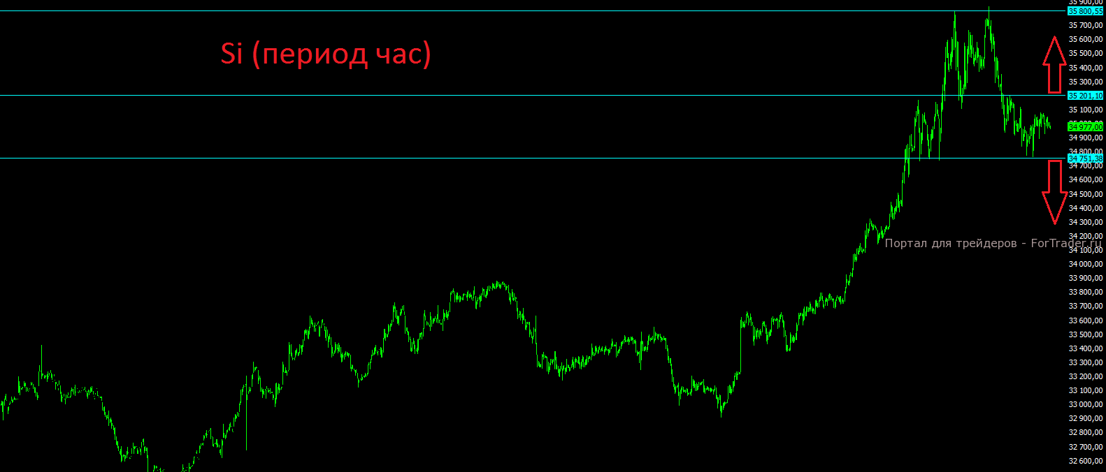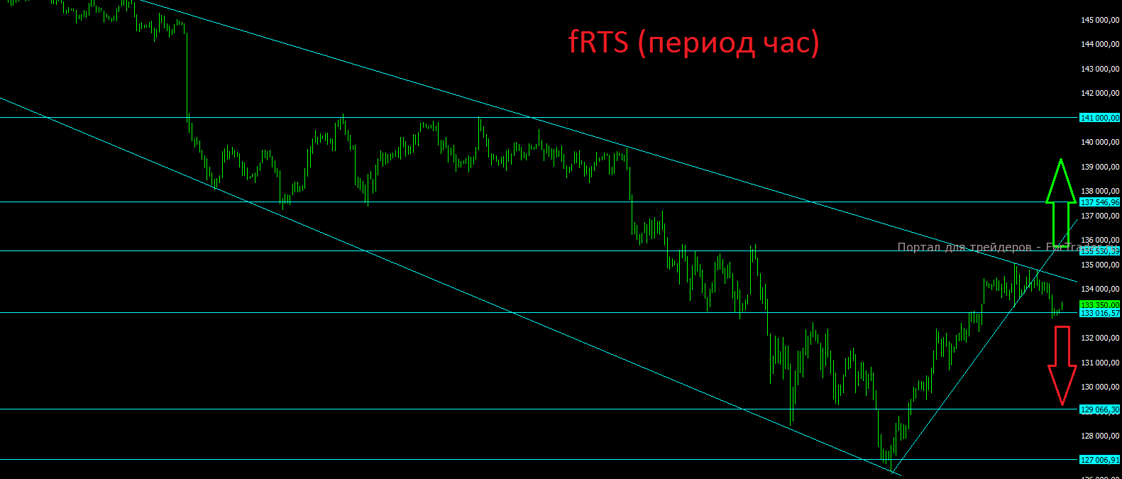Фьючерс на индекс РТС вчера чётко оттолкнулся от верхней границы нисходящего тренда (диагонального сопротивления). По-прежнему актуальными остаются уровень поддержки на отметке 133000 и уровень сопротивления на отметке 135500. В случае закрытия дня выше отметки 135500 появится шанс показать восходящую динамику вплоть до отметки 141000 пунктов. Если мы увидим закрытие 2-х дней подряд ниже отметки 133000 пунктов, то стоит готовиться к более существенной коррекции, возможно с обновлением минимумов текущего года.