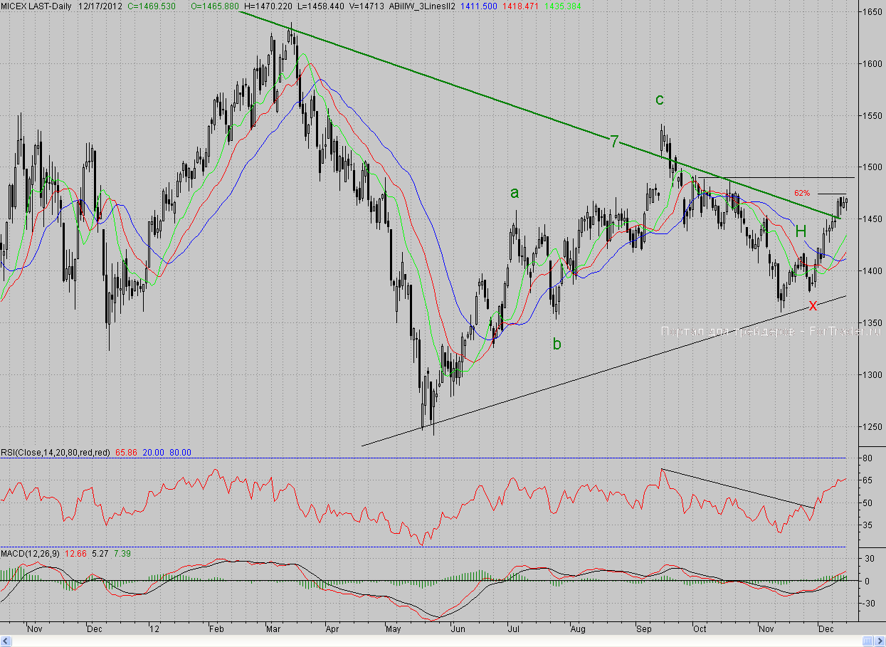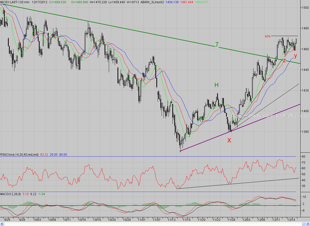 Исследуя 2-часовой график индекса ММВБ, видим, что с утра котировки попытались подрасти, но достаточно быстро бычий энтузиазм закончился, и котировки начали снижаться. На этот раз «мишки» сумели-таки преодолеть краткосрочный растущий тренд. Однако ничего страшного для быков в этом не было, так как угол наклона данного тренда был довольно большой, и рано или поздно он был бы покорен. А вот более значимый уровень обороны в лице локального минимума Z (1454,6 п.) покупатели уверенно отстояли. А ближе к вечеру они собрались с силами и в очередной раз пошли в наступление, полностью отыграв дневное снижение и закрыв день почти на максимуме.