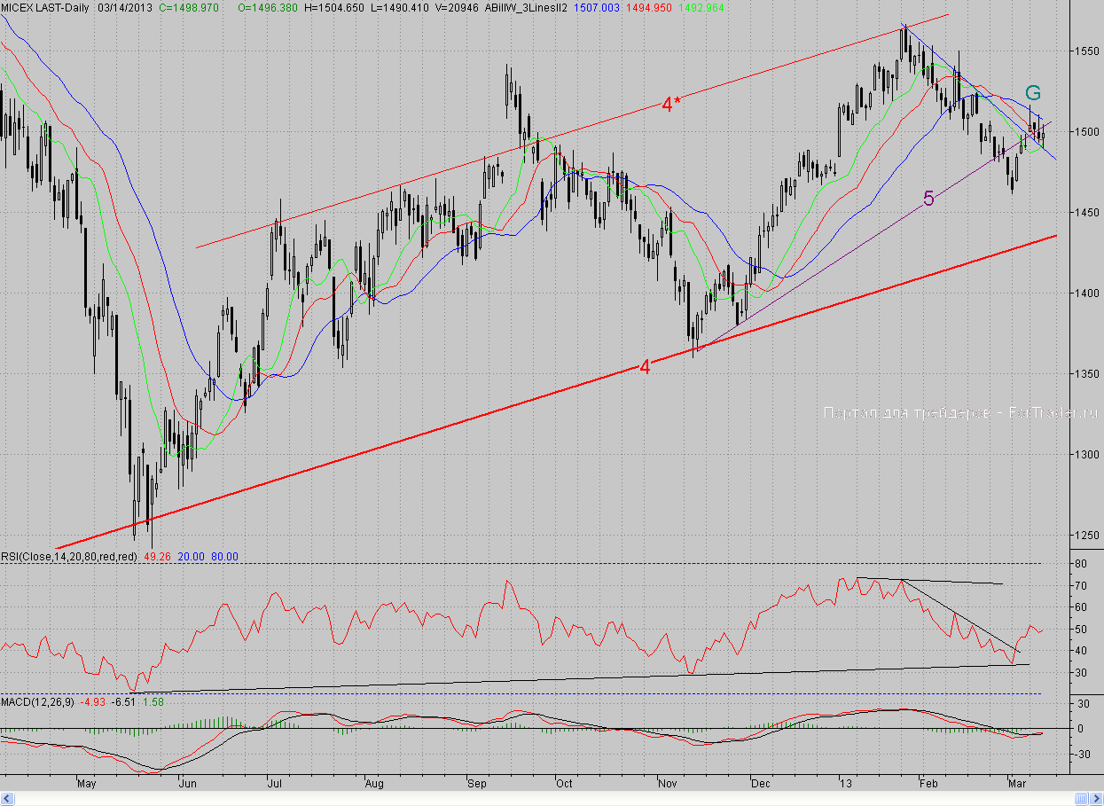 Плюсом для покупателей является то, что индекс «по дням» по Б.Уильямсу находится в покупке, правда, номинальной – с момента преодоления дневного фрактала на покупку (1506,5 п.) закрытие дня ещё ни разу не было выше этого уровня. И торги последних четырёх дней сформировали «флаг», который обычно является фигурой продолжения тенденции. Однако для реализации этого сценария ценам надо уверенно преодолевать не только верхнюю грань «флага» и среднесрочный растущий тренд (5), но и максимум G от 11 марта (1516,5 п.).