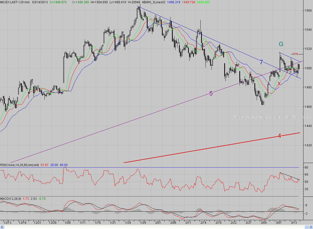 Исследуя 2-часовой график индекса ММВБ, видим, что первая половина торгов прошла практически без изменений – котировки торговались в узком боковике, не демонстрируя попыток двигаться в какую-то из сторон. После обеда равновесие решили нарушить «медведи» и, проколов 2-часовой фрактал на продажу Y (1494,9 п.), стали продвигаться ниже. Однако более мощный редут «бычьей» обороны в лице среднесрочного падающего тренда (7), а также окна от 11 марта и предыдущего 2-часового сигнала Х (1489 п.) быстро охладил их пыл. От этого района теперь уже «быки» боданулись и в целом отыграли дневную просадку, закрывшись в небольшом плюсе.