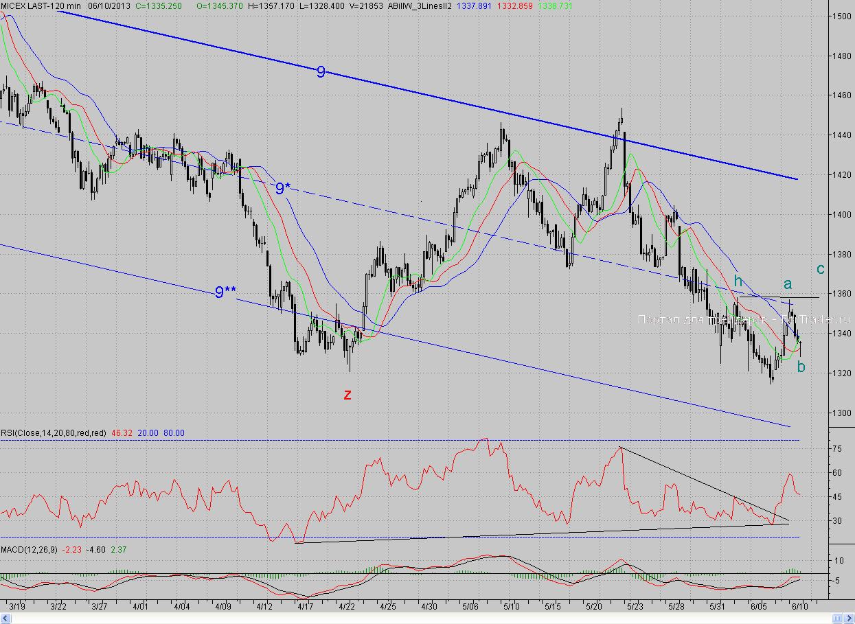 Исследуя 2-часовой график индекса ММВБ, видим, что открывшись с небольшим гэпом вверх, котировки продолжили рост предыдущего дня. Однако на этот раз энтузиазма у «быков» было уже гораздо меньше, и цены добрались лишь до ближайшего сопротивления в лице средней линии (9*) среднесрочного падающего канала (9-9**) и максимума h (1358 п.). На этом редуте наступающих уже ждали «медведи», которые довольно быстро перехватили инициативу (благо цены на нефть пошли вниз) и погнали котировки обратно на Юг. В итоге была потеряна не только вся высота, набранная за утро, но и большая часть пятничного подъёма. И только под занавес торгов «быкам» удалось немного бодануться, в результате чего день закрылся не на самом минимуме.