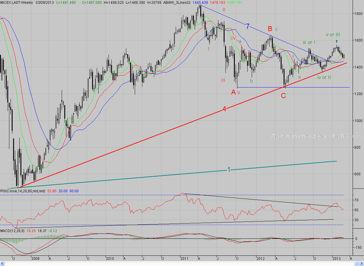 Однако «медведи» это тоже понимают, поэтому предполагаем, что в данном районе они станут более агрессивными. Ведь пока все индикаторы говорят о том, что рост последних двух дней является отскоком. К тому же грядут длительные выходные, и часть игроков предпочтёт зафиксировать прибыль по краткосрочным «лонгам». Да и внешний фон пока неоднозначный: по американским рынкам ситуация становится рискованной (хотя DJIA на историческом максимуме, но на дневном графике по техническим индикаторам образовались потенциальные дивергенции, то же и по S&P500), нефть также пока не демонстрирует признаков к восстановлению после двухнедельного снижения. Так что у «медведей» есть все шансы возобновить наступление. В этом случае в роли ближайшей поддержки выступит вчерашнее незакрытое окно (1484 п.), а далее – окно вторника (1464 п.).