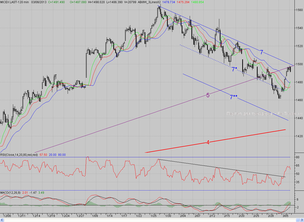 Исследуя 2-часовой график индекса ММВБ, видим, что на позитивном внешнем фоне котировки открылись с гэпом вверх и продолжили рост. Однако, как и ожидалось, сильным сопротивлением оказалась кластерная зона, в которой проходят среднесрочные растущий (5) и падающий (7) тренды, а также находится предыдущий локальный максимум (1496,6 п.). И как ни пытались «быки» прободать этот район, пройти выше им не удалось. А под самый занавес на фоне ухудшения внешней конъюнктуры (снижение нефти и фьючерса S&P) по российскому рынку прошла волна продаж. Однако развиться негативные настроения не успели, и день закрылся в умеренном плюсе.