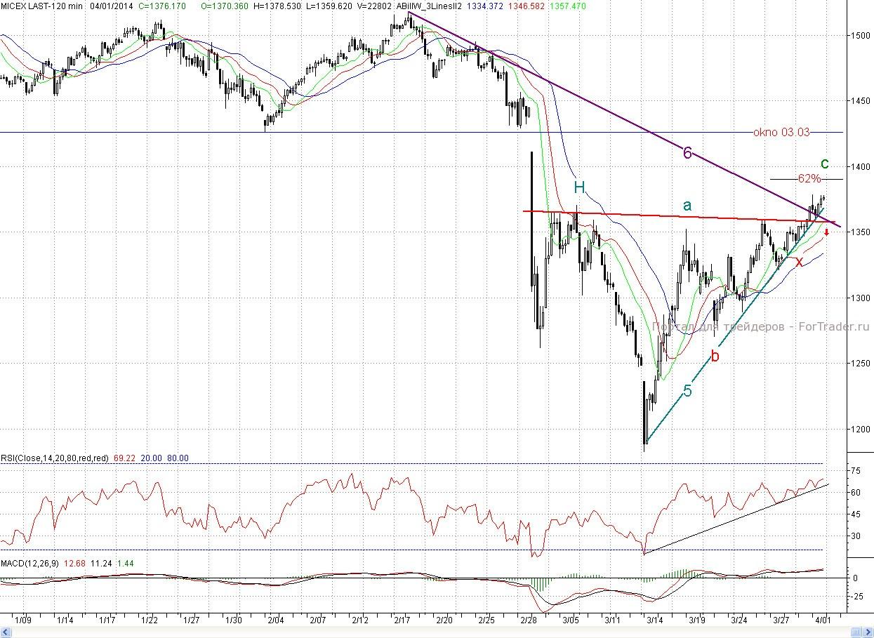 Исследуя 2-часовой график индекса ММВБ видим, что на позитивном внешнем фоне сразу с открытия котировки преодолели предыдущий локальный максимум H (1 370,36 п.) и попытались продолжить рост. Однако бычий энтузиазм довольно быстро стал улетучиваться, и цены не дойдя до следующего сильного сопротивления — уровень 62% коррекции (~1 390 п.) от падения с середины февраля начали снижаться. Но продажи были неагрессивные и ближайшая поддержка в лице краткосрочного растущего тренда (5) и преодоленной накануне «линии шеи» справилась со своей ролью. От данного уровня после обеда снова возобладали покупки, и окончанию сессии котировки вплотную подошли к утреннему максимуму. В результате день завершился в плюсе (0,47%).