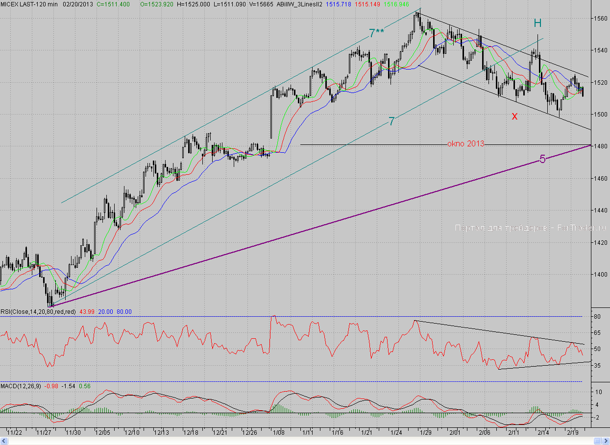 Уровень фрактала Х и предыдущего локального минимума будет пройден сразу с открытия, и тогда хорошей поддержкой будет только среднесрочный растущий тренд (5) и новогоднее окно (~1480 п.). Промежуточной остановкой выступит нижняя граница среднесрочного падающего канала (~1 490 п.)