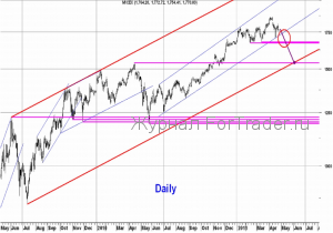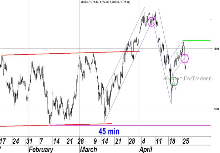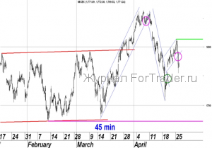 На 45-ти минутном графике вчера был пробит вниз краткосрочный восходящий канал, а сегодня был «закрыт» гэп вверх, который был образован 20-го апреля. После этого рынок развернулся вверх. Если нижняя граница краткосрочного восходящего канала на дневном графике всё-таки будет пробита, скорей всего снижение продолжится до горизонтального уровня поддержки 1674-1681 п. Пробой этого уровня вероятнее всего приведёт к дальнейшему снижению до нижней границы среднесрочного восходящего канала. Сигналом к завершению нисходящей коррекции будет пробой горизонтального сопротивления 1814 п. Если это произойдёт, скорей всего индекс ММВБ попытается обновить трёхлетний максимум.