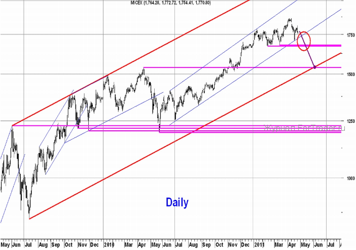 После того, как в начале апреля индекс ММВБ обновил трёхлетний максимум, достигнув отметки 1865 п., произошла достаточно резкая нисходящая коррекция до нижней границы краткосрочного восходящего канала, в котором индекс повышался с июля прошлого года. Немного не дойдя до отметки 1700 п., индекс развернулся вверх и вчера пробил отметку 1800 п. Однако после достижения уровня 1814 п., снижение возобновилось.