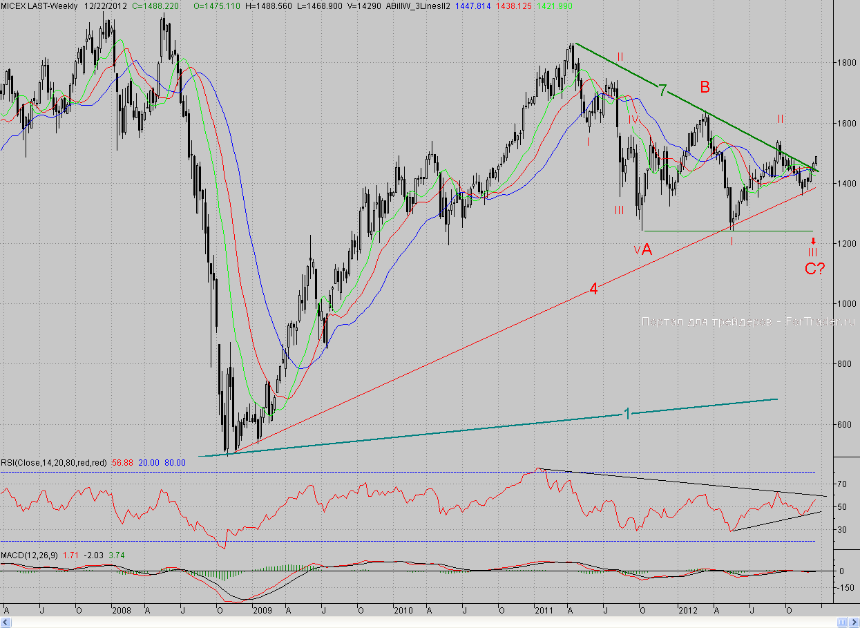 Сегодня заключительный день торговой недели, и пока она закрывается хорошо – уже вторую неделю подряд цены находятся выше полуторагодового падающего тренда (7), что является хорошим знаком. Так что предпосылки для продолжения среднесрочного роста созданы, и главное для «быков» — удержать район 1450 п., что сегодня даже учитывая внешний негативный фон, им вполне по силам.