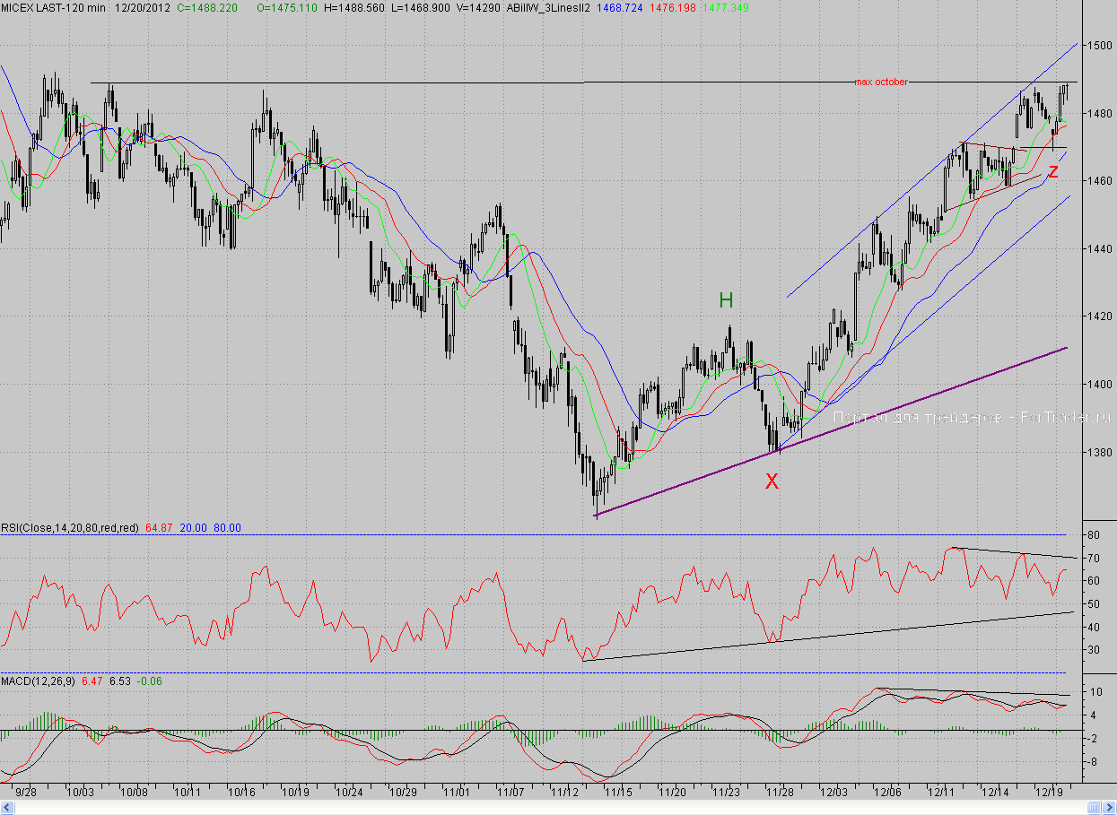 Исследуя 2-часовой график индекса ММВБ, видим, что котировки открылись с гэпом вниз и продолжили снижении. Но, как и предполагалось, хорошей поддержкой выступило незакрытое окно вторника (~1470 п.). На данном уровне цены развернулись и пошли в рост, в результате чего уже к обеду они ликвидировали утренний разрыв. Однако на этом «быки» решили не останавливаться и продолжили наступление. Правда, район октябрьских максимумов (1487-1492 пп.) в очередной, уже третий, раз за последние три дня остановил их. И хотя цены били в данный уровень трижды за вечер, тем не менее, покорить его не удалось.