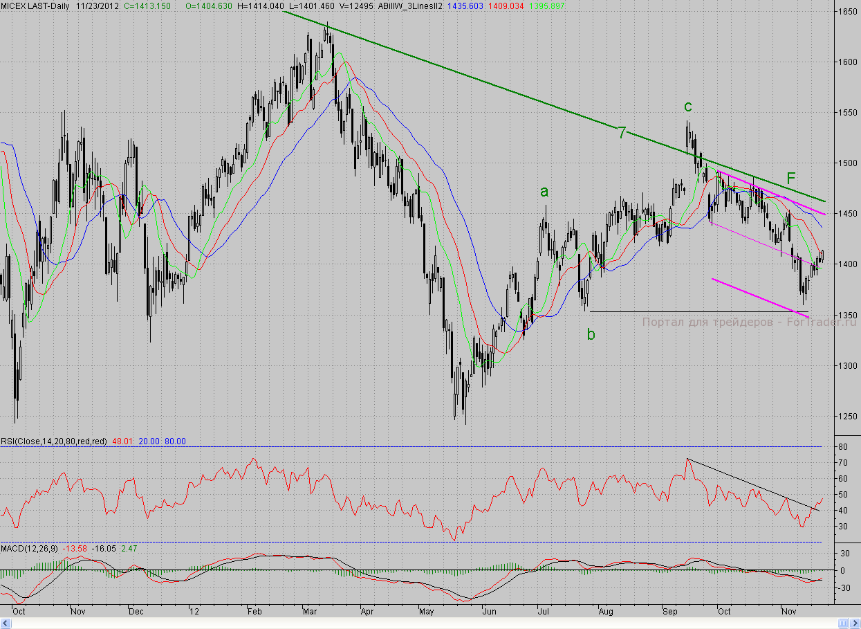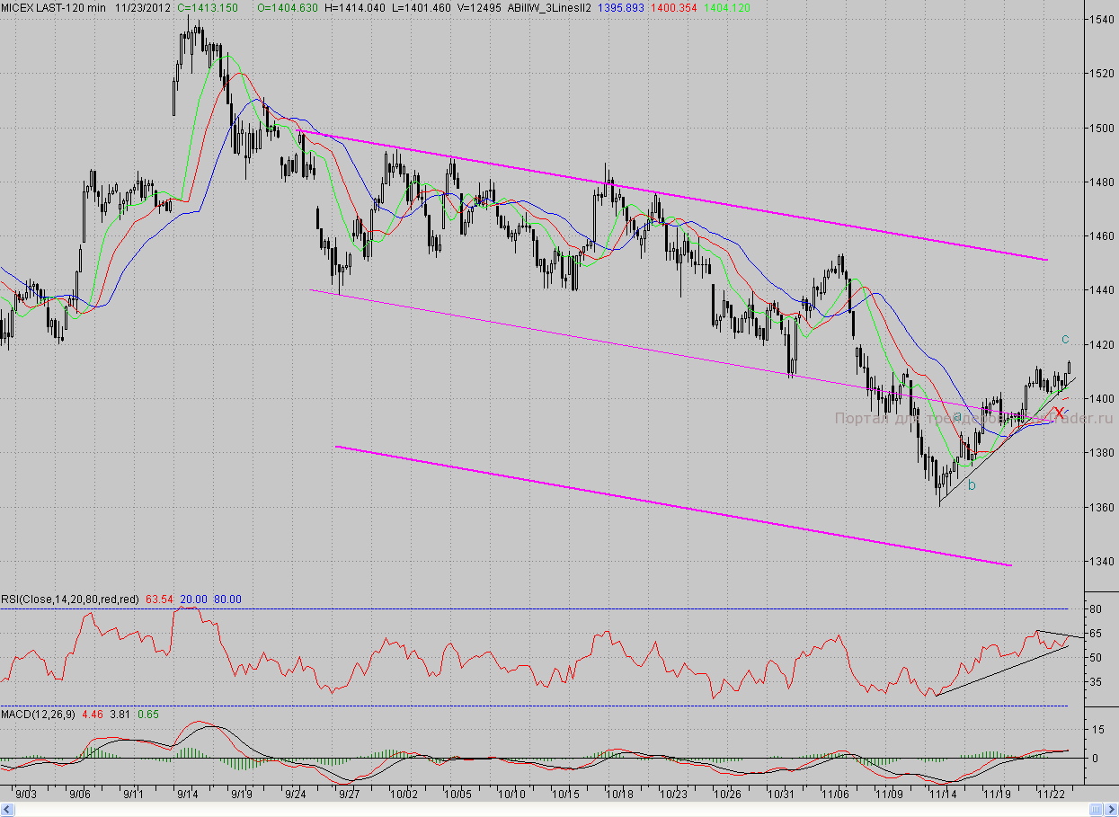 В случае если покупателям удастся удержать инициативу и продолжить рост, то следующим сопротивлением станет уровень 62%-ной коррекции от последней волны снижения (~1418 п.) и незакрытое окно от 8 ноября (~1420 п.), а далее – уровень 38%-ной коррекции от всего падения с середины сентября (~1430 п.). Если же «медведям» надоест расступаться и они возобновят двухмесячное наступление, то ближайшей поддержкой снова будет краткосрочный растущий тренд (~1408 п.), а далее – минимум пятницы, который стал 2-часовым фракталом на продажу Х (1401,4 п.). Более сильным редутом «бычьей» обороны остаётся кластерная зона, в которой проходит средняя линия падающего канала и минимум от 21.11 (1389,1 п.).
