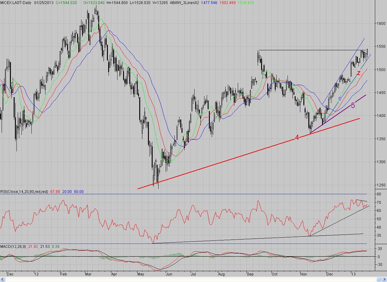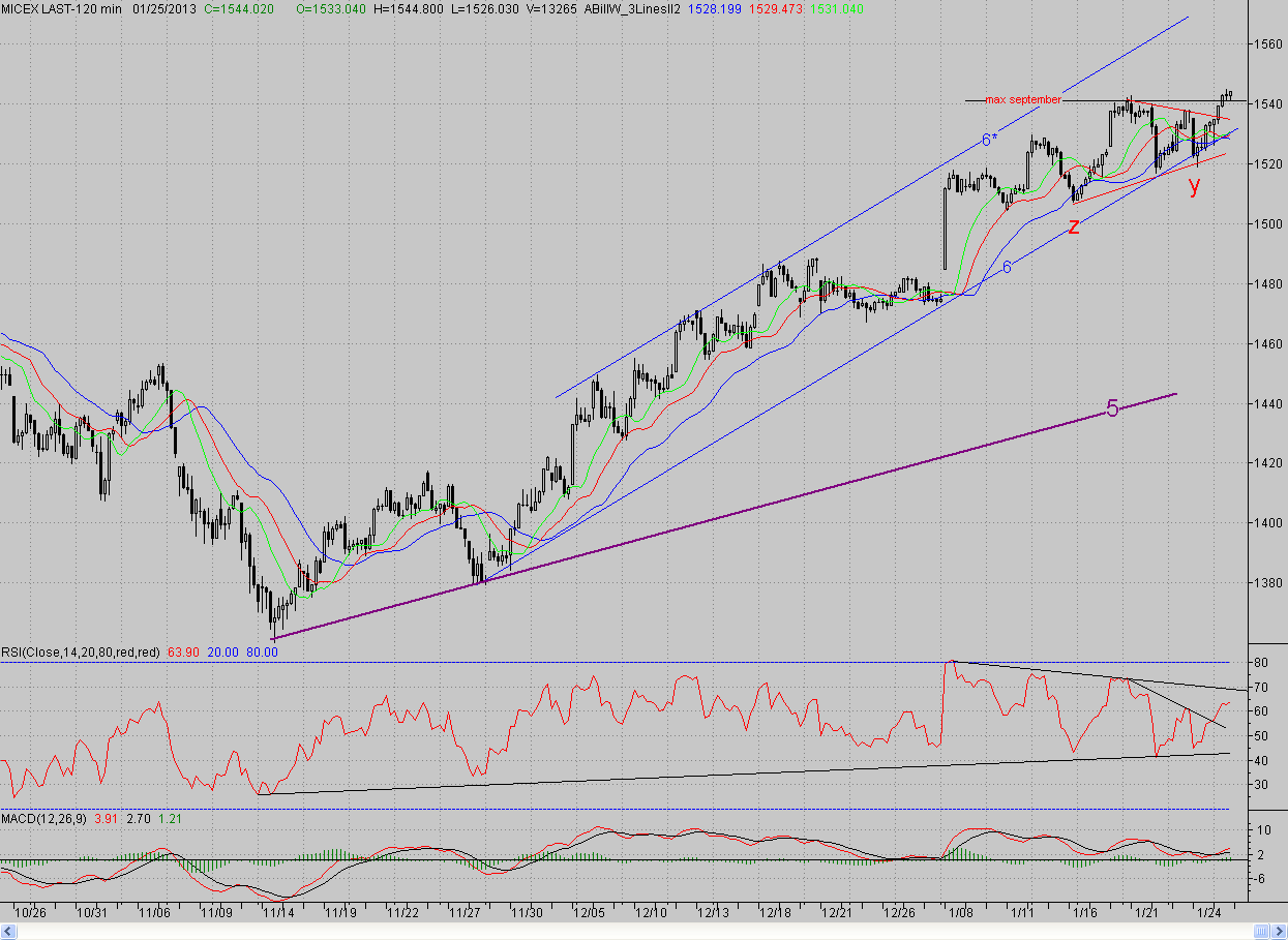 Исследуя 2-часовой график индекса ММВБ, видим, что сразу с открытия «медведи» провели атаку, но ближайшая поддержка в лице среднесрочного растущего тренда (6) снова оказала «быкам» поддержку. От данного района пошли покупки, и цены не только с легкостью отыграли утреннюю посадку, но и уверенно преодолели верхнюю грань «треугольника». Более того, после обеда рост продолжился, и цены прокусили и предыдущий локальный максимум (1542,8 п.), хотя уверенно его покорить не удалось, тем не менее, и день, и неделя закрылись выше этого рубежа.