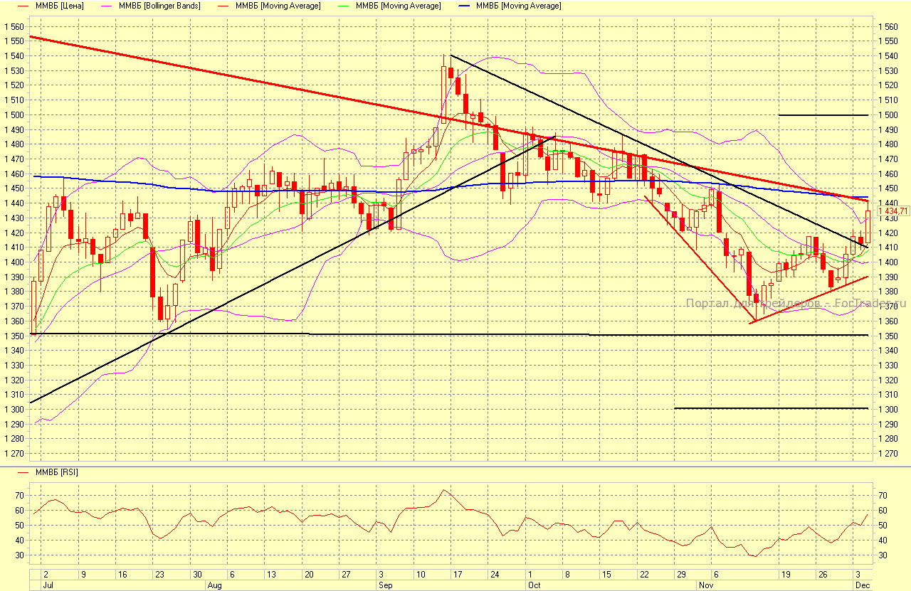 С прошлой среды рынок снова предпринял несколько попыток преодолеть сопротивление ММВБ-1420, и только сегодня в последний день закрывающегося окна для новогоднего ралли быки сумели прорвать 1420 и выйти на первое серьезное сопротивление — 200-дневную на дневных графиках.