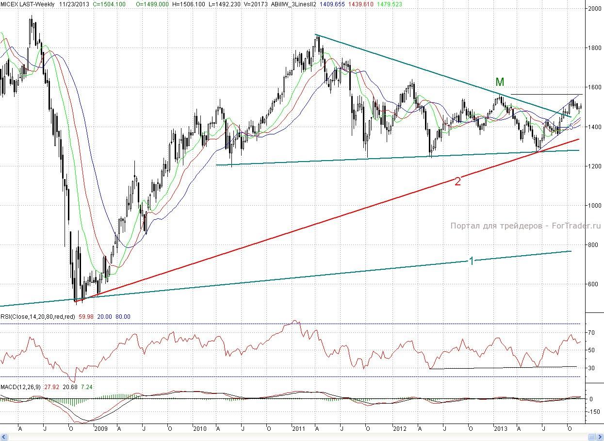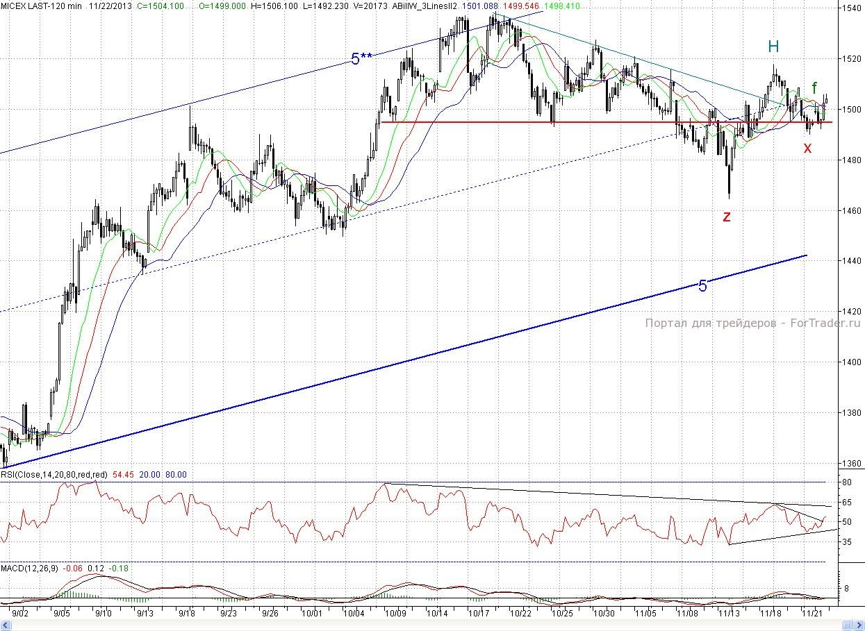 Исследуя 2-часовой график индекса ММВБ, видим, что на позитивном внешнем фоне, открывшись с гэпа вверх, дальнейшего роста практически не произошло. Более того, ближе к полудню котировки начали припадать. Однако и продажи были неагрессивные, и максимум чего смогли добиться медведи — это закрыть утреннее окно. От данного района во второй половине торгов начались покупки, и цены преодолели утренний максимум f (1 502,47), ставший к тому времени новым 2- часовым фракталом на покупку. В результате закрытие произошло в неплохом плюсе (0,67%)