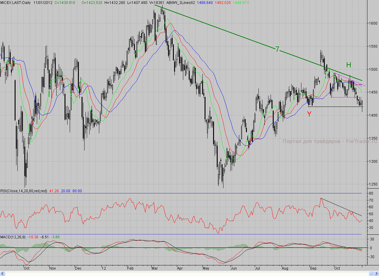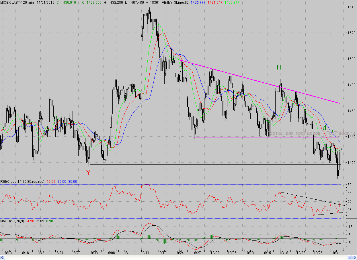 С технической точки зрения минусом для покупателей является то, что на дневном графике по индикаторам нет «бычьих» дивергенций, и медленная кривая MACDа находится в отрицательной зоне и направлена вниз. А это значит, что среднесрочно рынок пока смотрит на Юг. Однако на 2-часовом графике дивера сохранились, несмотря на вчерашнюю просадку, да и на индикаторе RSI был пробит наверх падающий тренд – так что у «быков» есть ещё шанец пободаться за своё место под северным солнцем. И основной задачей для них на сегодня является отвоевание нижней грани «треугольника» и преодоление 2-часового фрактала на покупку d (1439,4 п.). Далее расположено незакрытое окно от 26 октября (1450 п.). Роль ближайшей поддержки сыграет потенциальное утреннее окно, а далее – уровень фрактала Y.