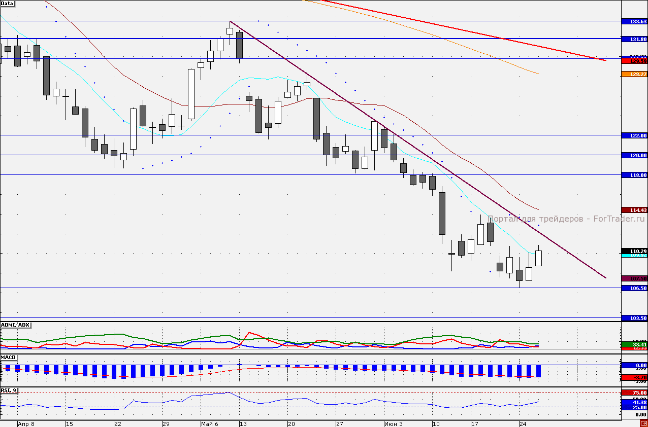 Неплохую динамику сегодня демонстрируют акции «Газпрома». Бумаги взяли курс на линию нисходящего тренда – 112,15 руб., действующего с середины мая текущего года. Показания трендовых индикаторов не исключают вероятности того, что акции могут достичь ближайшего целевого значения. В частности индикатор ADMI/ADX показывает, что силы «быков» по бумагам преобладают (линия «быков» находится выше линии «медведей»). Таким образом, стоит удерживать длинные позиции по бумагам с целью приближения акций к линии нисходящего тренда (сегодня 112,15 руб.). Наш 30- минутный торговый робот находится в «лонгах», удерживая позиции от отметки 108,30 руб.