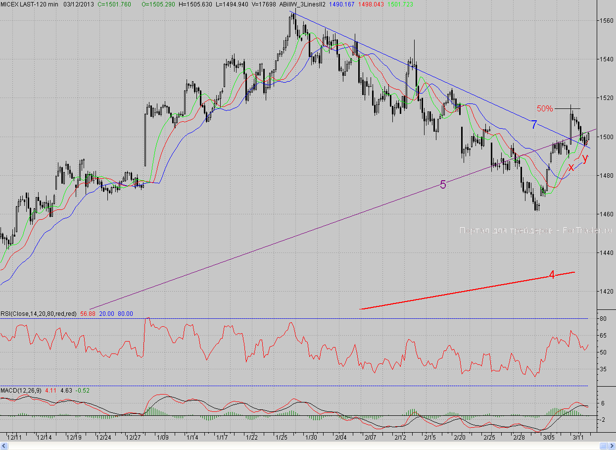 Исследуя 2-часовой график индекса ММВБ, видим, что открывшись с небольшим гэпом вверх, котировки сразу же развернулись и продолжили коррекцию, начатую днём ранее после сильного роста. Однако, как и ожидалось, в кластерной зоне, где проходили среднесрочные растущий (5) и падающий (7) тренды, «быки» по-хозяйски встретили «мишек». Они даже дали им возможность протестировать нижнюю границу этой зоны в лице старого тренда (7), после чего от данного рубежа организовали отскок, который, как по учебнику, закончился как раз на верхней границе зоны в лице тренда (5).