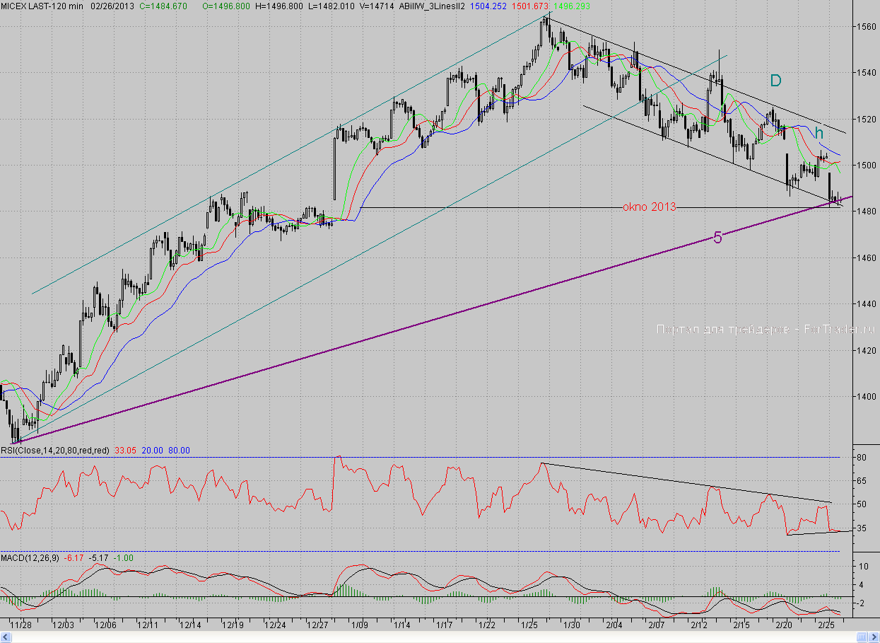 Исследуя 2-часовой график индекса ММВБ, видим, что на негативном внешнем фоне котировки открылись с большим гэпом вниз и продолжили падение, быстро преодолев все ближайшие поддержки. Но, как и ожидалось, ключевая поддержка в лице кластерной зоны, в которой проходят среднесрочный растущий тренд (5), нижняя граница среднесрочного падающего канала, а также расположено и новогоднее окно, справилась со своей ролью. И хотя «медведи» дважды пытались преодолеть этот район, но «быки» упорно стояли на нём, понимая, что в случае сдачи этого важного рубежа ворота мясокомбината приоткроются.