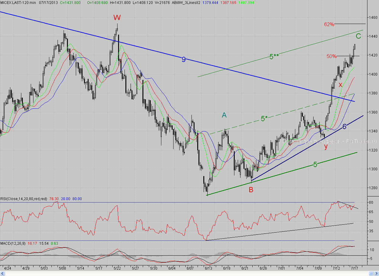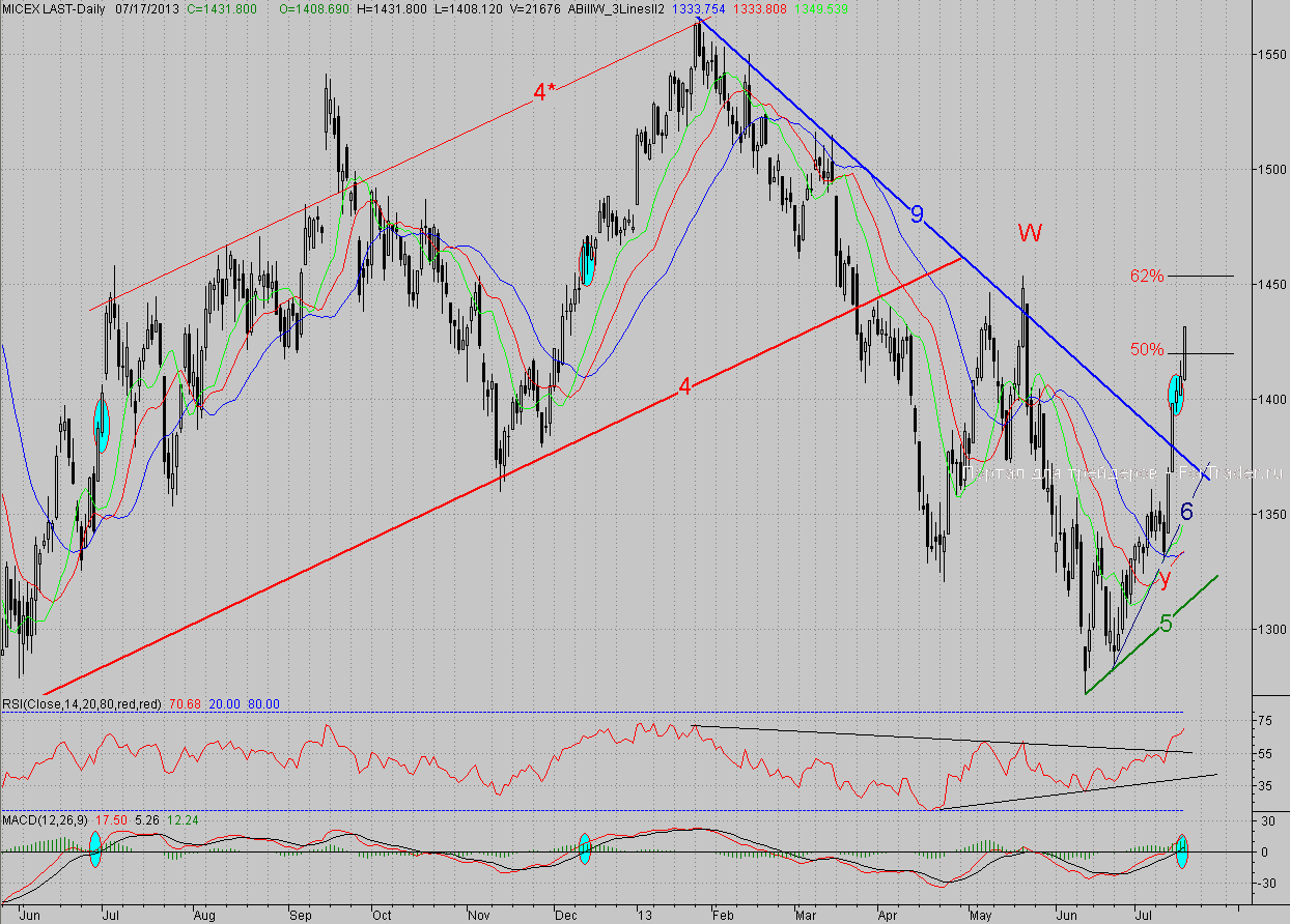 Таким образом, покупатели сохранили инициативу в своих руках и после небольшой передышки продолжили покорять новые вершины. Вот и сегодня «быки» попытаются продвинуться ещё выше. С технической точки зрения плюсом для них является то, что на дневном графике ещё позавчера поступил сильный «бычий» сигнал – медленная кривая MACDа зашла в положительную зону. А в таком случае, как мы писали уже несколько раз, рост продолжается (эти моменты выделены на графике эллипсами). И следующей целью является кластерная зона, в которой проходит верхняя граница растущего канала (5-5**), а также находятся уровень 62%-ной коррекции и недельный фрактал на покупку W (1453,6 п.).