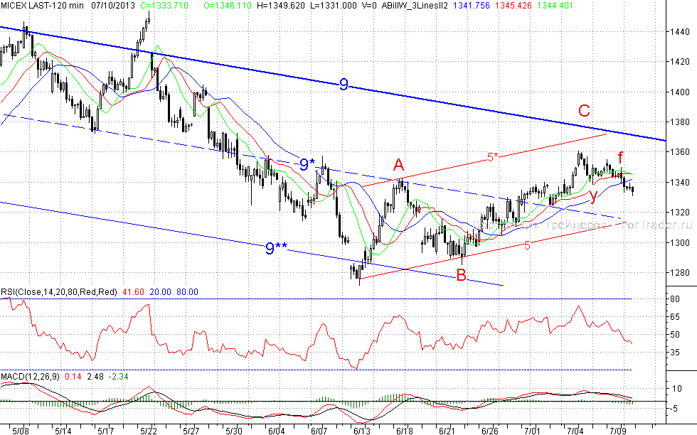 Если «быки» будут достаточно настойчивы и сохранят утренний запал, то на всеобщей эйфории они вполне смогут наконец-то добраться до среднесрочного падающего тренда (9), при этом ближайшим сопротивлением станет образовавшийся вчера 2-часовой фрактал на покупку f (1349,6 п.). Роль ближайшей поддержки при этом сыграет утреннее окно и вчерашний минимум, основным редутом «бычьей» обороны остаётся кластерная зона, в которой проходят средняя линия (9*) канала (9-9**) и краткосрочный растущий тренд (5) (1310-1315 пп.).