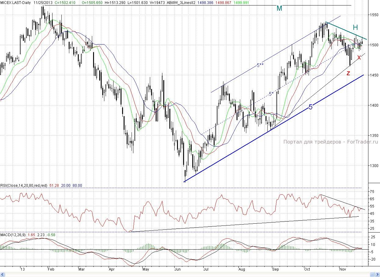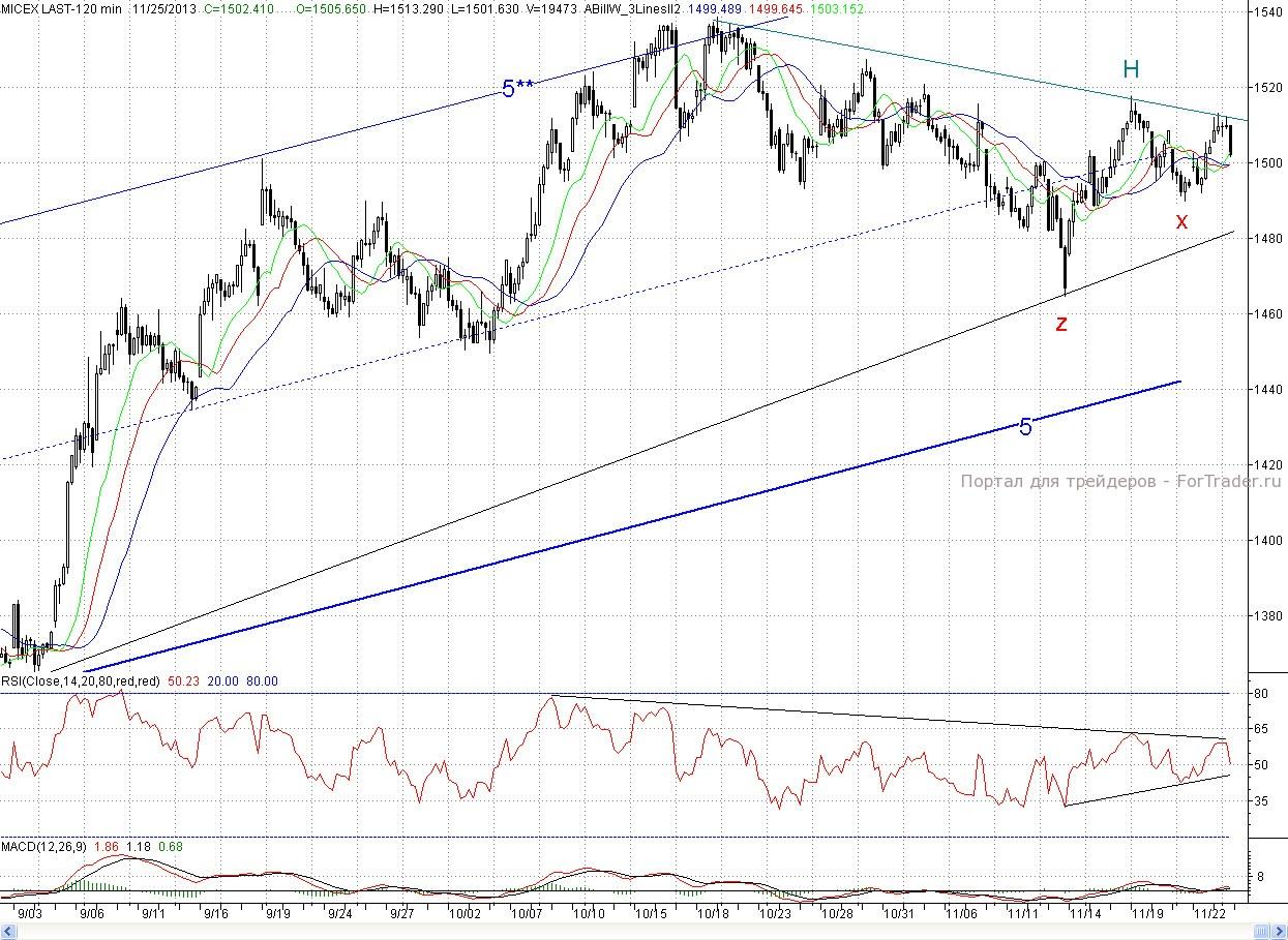 С технической точки зрения картина на дневном графике нейтральная. Индекс ММВБ находится вне позиции. Но ключевой рубеж бычьей обороны повысился. Им теперь станет новый дневной фрактал на продажу Х (1 489,98 п.) взамен «старого» фрактала Z (1 466,82 п.), и до него меньше 1%. А этот фактор будет придавать дополнительные силы уже медведям, которые вчера довольно легко удержали аналогичный свой редут. И в случае если они уверенно преодолеют вышеназванный фрактал, то снижение с начала ноября возобновится. И целью его будет нижняя граница среднесрочного растущего канала (5-5**). Так что быкам надо сильно постараться, чтобы не попасть на мясокомбинат, ворота на который уже приоткрылись.