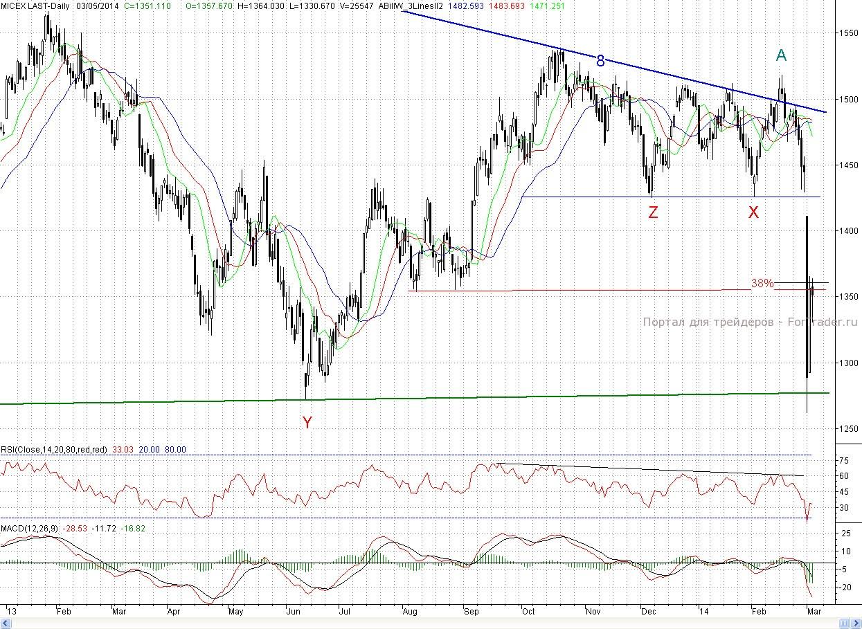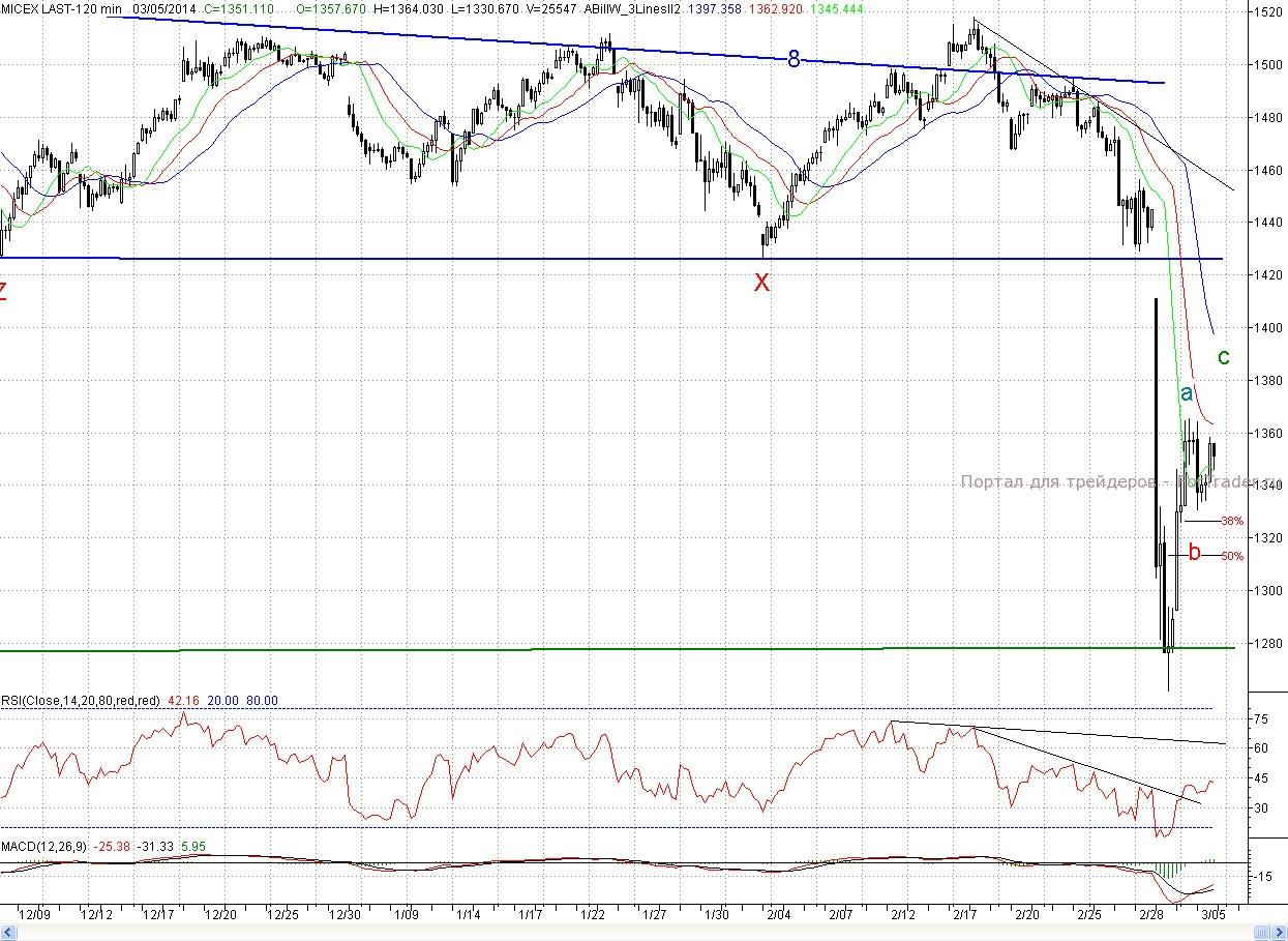 Возвращаясь к индексу ММВБ на сегодня ближайшим сопротивлением выступит уровень 38% коррекции (~1 360 п.) от всего падения с середины февраля, а далее максимум вторника а (1 365,21 п.). В случае уверенного преодоления которого отскок продолжится в форме трехволновки (a-b-c). И следующим сильным редутом будет уровень 50% (~1 390 п.). Роль ближайшей поддержки сыграет вчерашний минимум (1 330,67 п.), а далее уровни 38% коррекции (~1 325 п.) и 50%(~1 314 п.) от вторничного отскока Основным редутом быков остается район трехлетних минимумов (1 240-1 260п.)