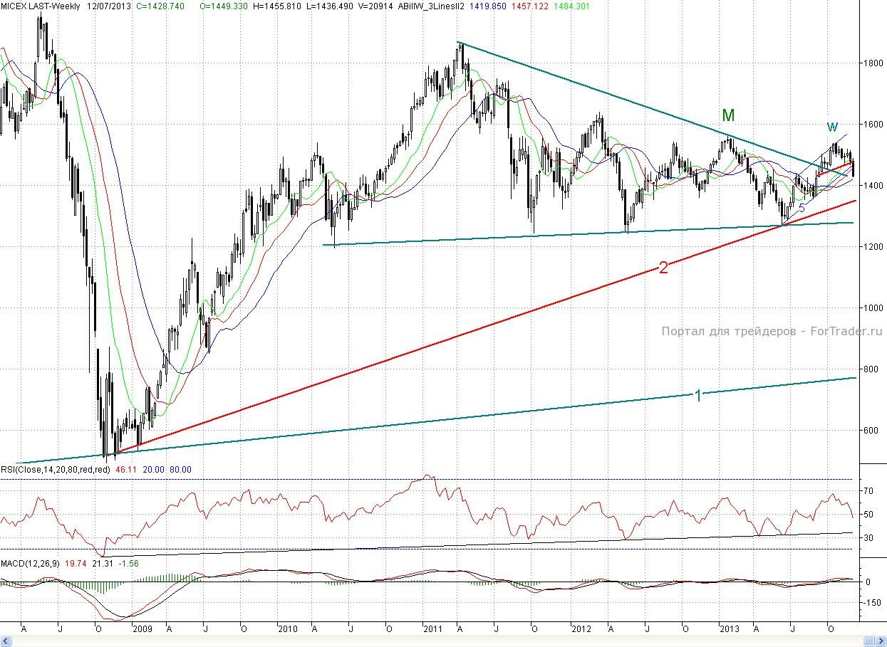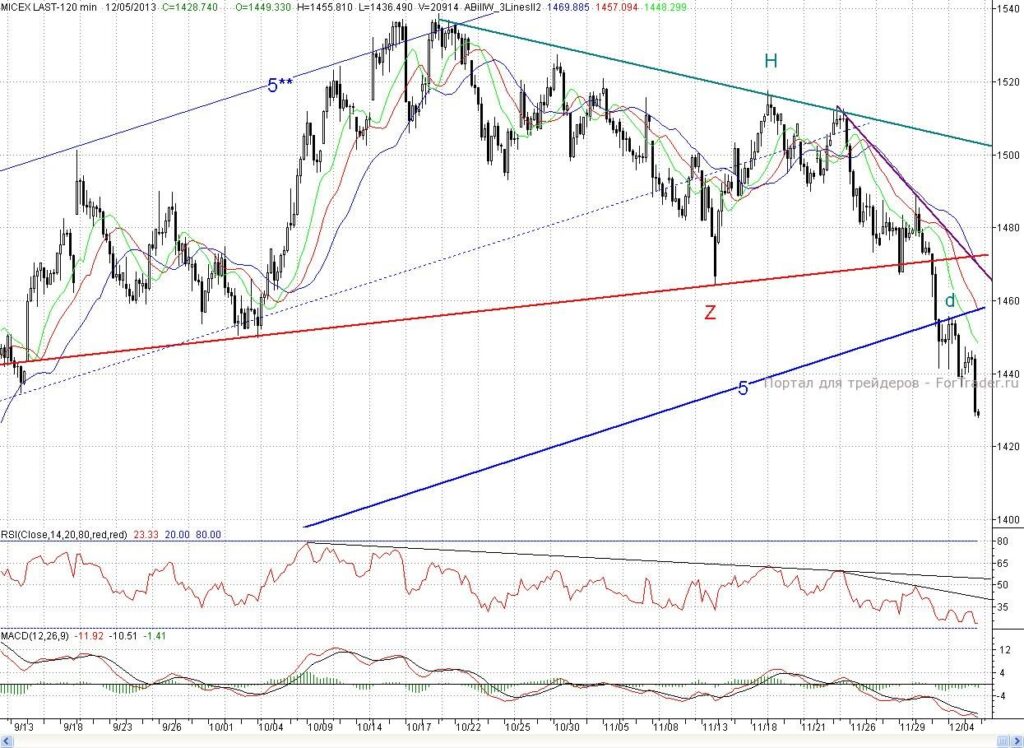 Исследуя 2-часовой график индекса ММВБ, видим, что открывшись с небольшим гэпом вверх, котировки снова попытались начать формировать отскок. Но и на этот раз покупатели не многого добились. Уже район вечернего максимума среды (~1 447 п.) оказался для них непреодолимой преградой, а про более сильный редут в лице 2- часового фрактала на покупку d (1 455.81 п.) и нижней границы пробитого среднесрочного растущего канала (5-5**) и говорить не приходится. В результате первую часть сессии цены провели в узком боковике. А во второй половине торгов медведи, видя, в общем — то беззубость быков, усилили прессинг и котировки обновили без малого трехмесячный минимум. В итого день снова завершился в минусе (0,7%).
