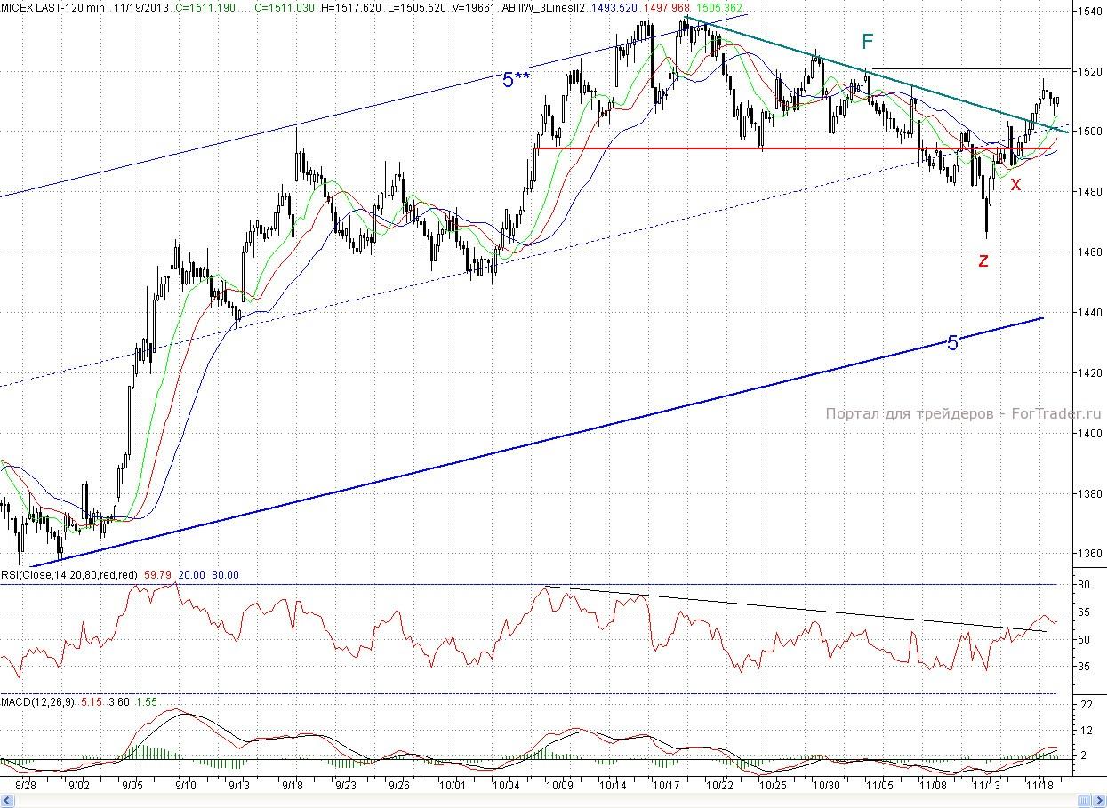 Исследуя 2-часовой график индекса ММВБ. видим, что сразу с открытия котировки продолжили рост понедельника. Предыдущий локальный максимум (1 515,75 п.) быки сумели преодолеть, а вот на более сильный редут в лице дневного фрактала на покупку F (1 521,02 п.) сил не хватило. Ближе к полудню началась фиксация прибыли, и к окончанию торгов цены полностью растеряли утреннюю высоту. В результате закрытие дня произошло лишь в номинальном плюсе (0,04%)