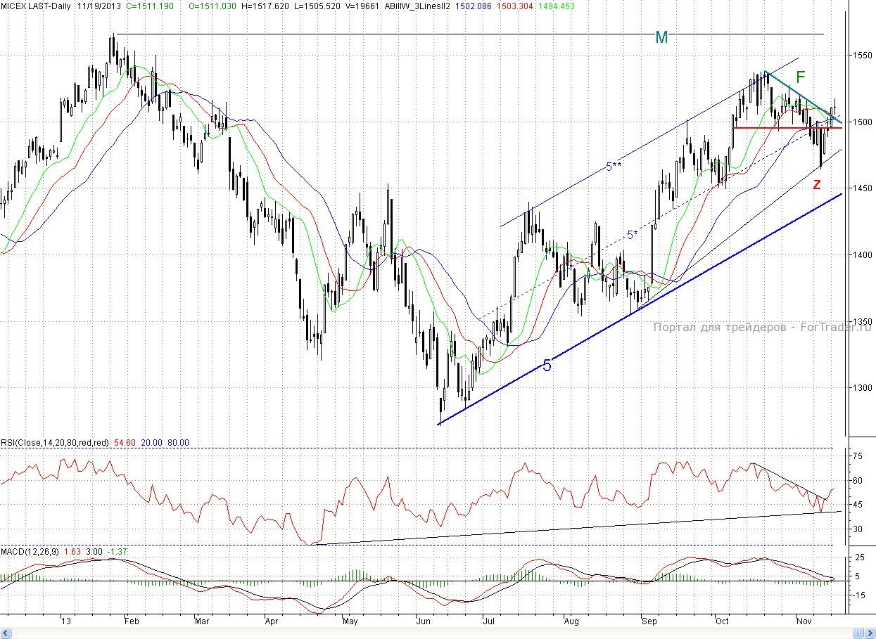С технической точки зрения картина на 2- часовом графике играет за покупателей. Индекс ММВБ по Б. Уильямсу находится в покупке. Дивергентный тренд по RSI пробит вверх, а линии MACDа находятся в положительной зоне и тоже направлены вверх. Однако на дневном интервале картинка не такая благоприятная. Индекс находится вне позиции. Медленная кривая MACDа хотя и расположена выше нулевой линии, но приближается к ней. К тому же снизу осталось два незакрытых окна, и пока не образовалось заходной растущей дневной волны. Да и форма вчерашней свечи разворотная. Правда необходимо подтверждение, а иначе ее можно трактовать и как передышку перед дальнейшим ростом. Так что ситуация сейчас «пограничная»