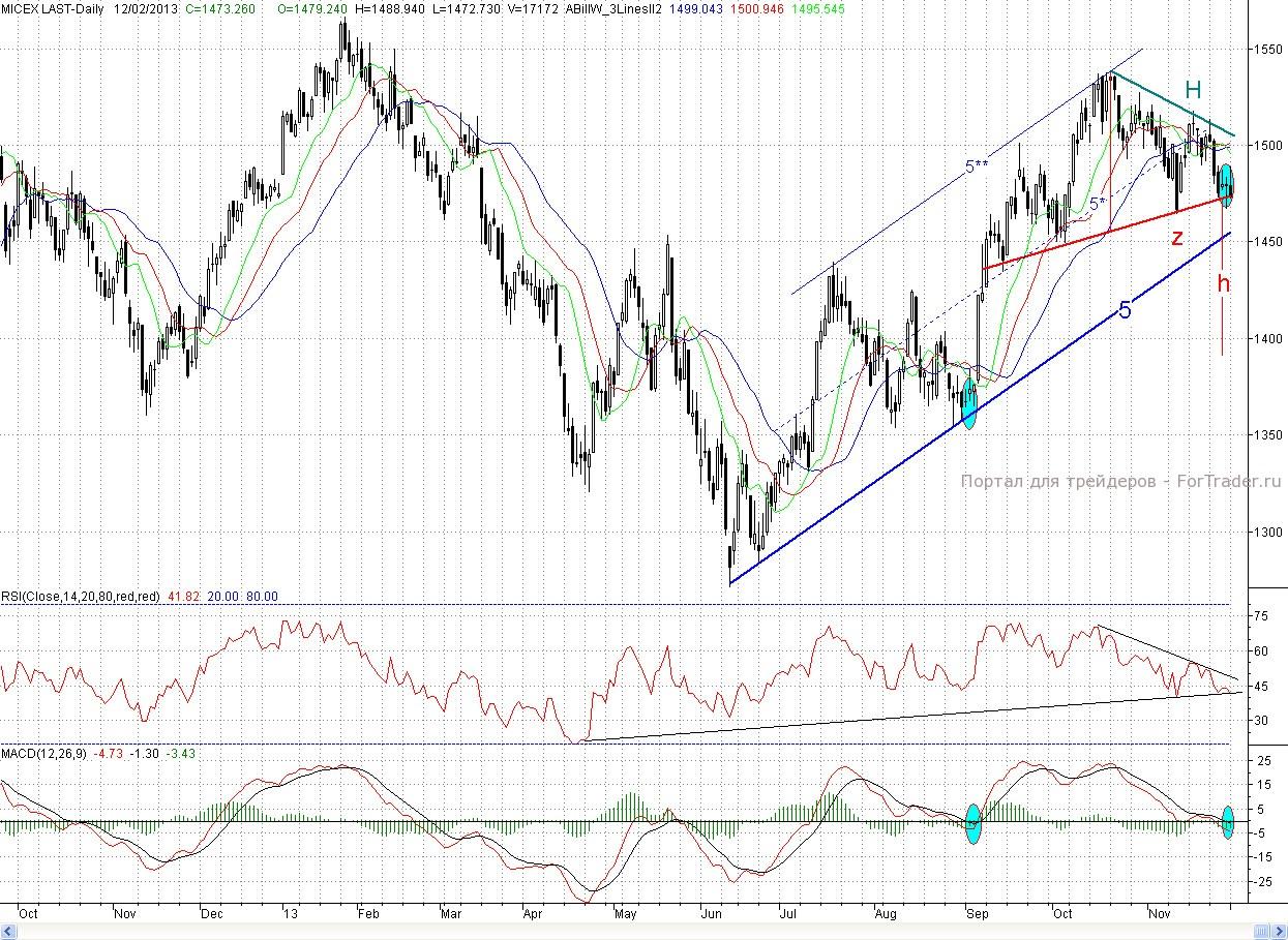 Таким образом, события продолжают развиваться по медвежьему сценарию. С технической точки зрения минусом для покупателей является то, что индекс ММВБ и по 2- часам и по дням по Б. Уильямсу находится в продаже. Бычьих дивергенций не образовалось, правда есть небольшое расхождение по гистограммному MACDу на обоих интервалах. Но вчера поступил очень сильный дневной медвежий сигнал. Медленная линия MACDа вошла в отрицательную зону. А когда такое случается, то, как правило, ничего хорошего покупателям не светит. Однако у них еще остается шанс выправить положение. Но для этого необходим прямо таки взрывной рост, такой, какой был в начале сентября. Этот момент на дневном графике выделен эллипсом. В тот раз медленная кривая MACDа также опустилась ниже «ватерлинии». Но несколькими днями ранее среднесрочный растущий тренд (5) дважды справился с ролью поддержки. А случившееся потом, медведи, наверное, вспоминают как в кошмарном сне. И сейчас ситуация во многом похожа. Вот только пора бы бычкам уже становиться настоящими БЫКАМИ, иначе если этого не произойдет, то перефразируя строчку из детской песенки можно будет сказать, «что остались от быченьки ножки да рожки». Так что час Х настал.