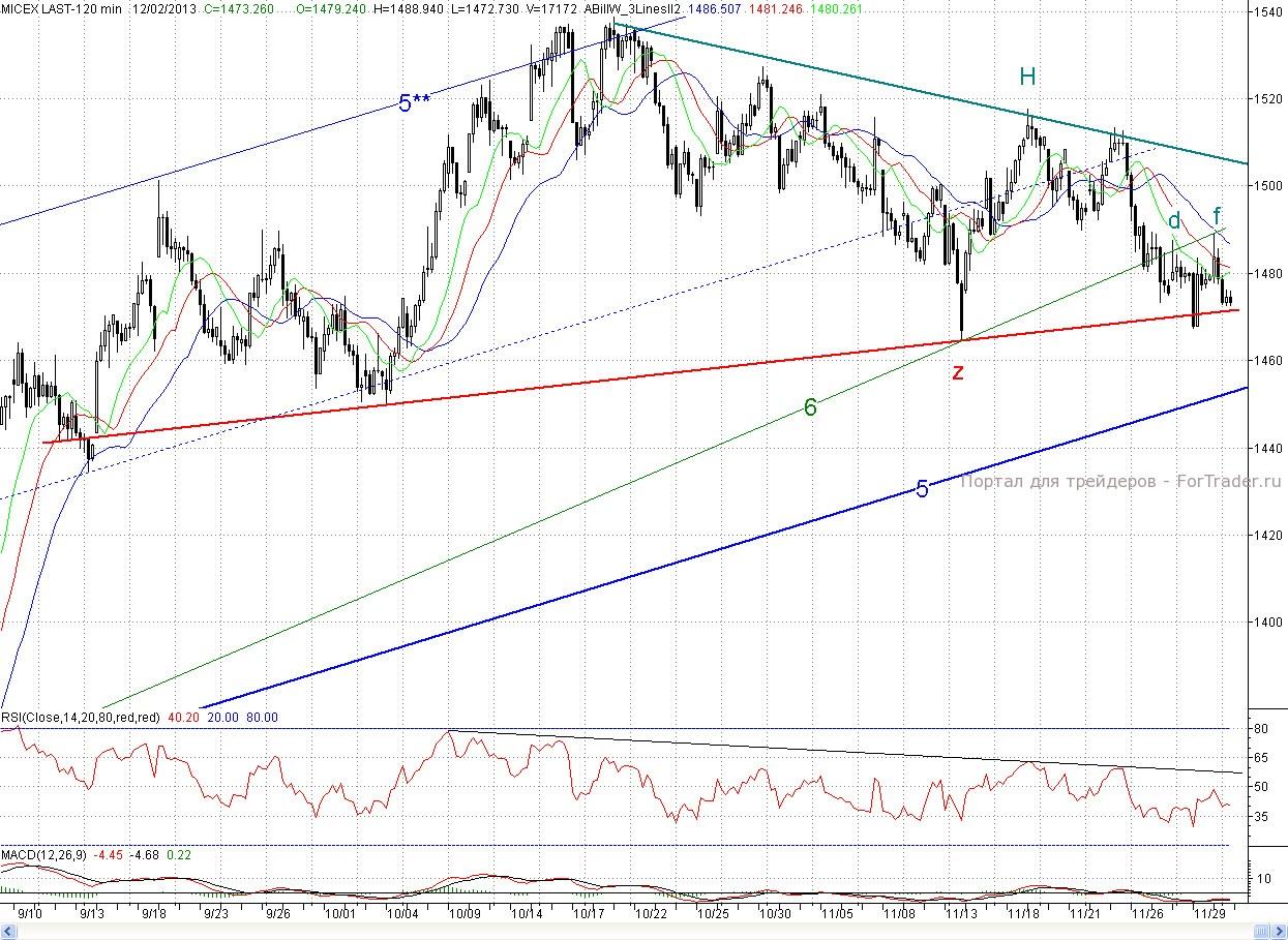 Исследуя 2-часовой график индекса ММВБ, видим, что на позитивном внешнем фоне, открывшись с небольшим гэпом вверх, котировки попытались продолжить рост. Однако преодолеть ближайшее сопротивление — предыдущий локальный максимум d (1 487,46 п.) и пробитый среднесрочный растущий тренд (6) цены не сумели, и бычий энтузиазм быстро улетучился. От данного редута снова возобладали продажи. Но они были неагрессивные, и ключевой рубеж бычьей обороны в лице линии шеи и недельного фрактала на продажу Z (1 464,61 п.) устоял. В результате день завершился в небольшом минусе (0,41%)