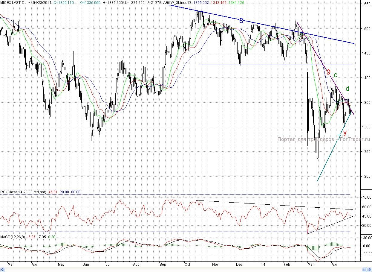 Исследуя 2-часовой график индекса ММВБ видим, что сразу с открытия снова началось медленное сползание котировок, и мишки словно мышки сумели «прогрызть» ближайшую поддержку в лице среднесрочного растущего тренда (7). Но дальше дело застопорилось. Поддержкой выступил уровень 62% коррекции (~1 324 п.) от предыдущего трехдневного роста, от которого цены немного подросли. В результате день завершился в небольшом минусе (0,49%).