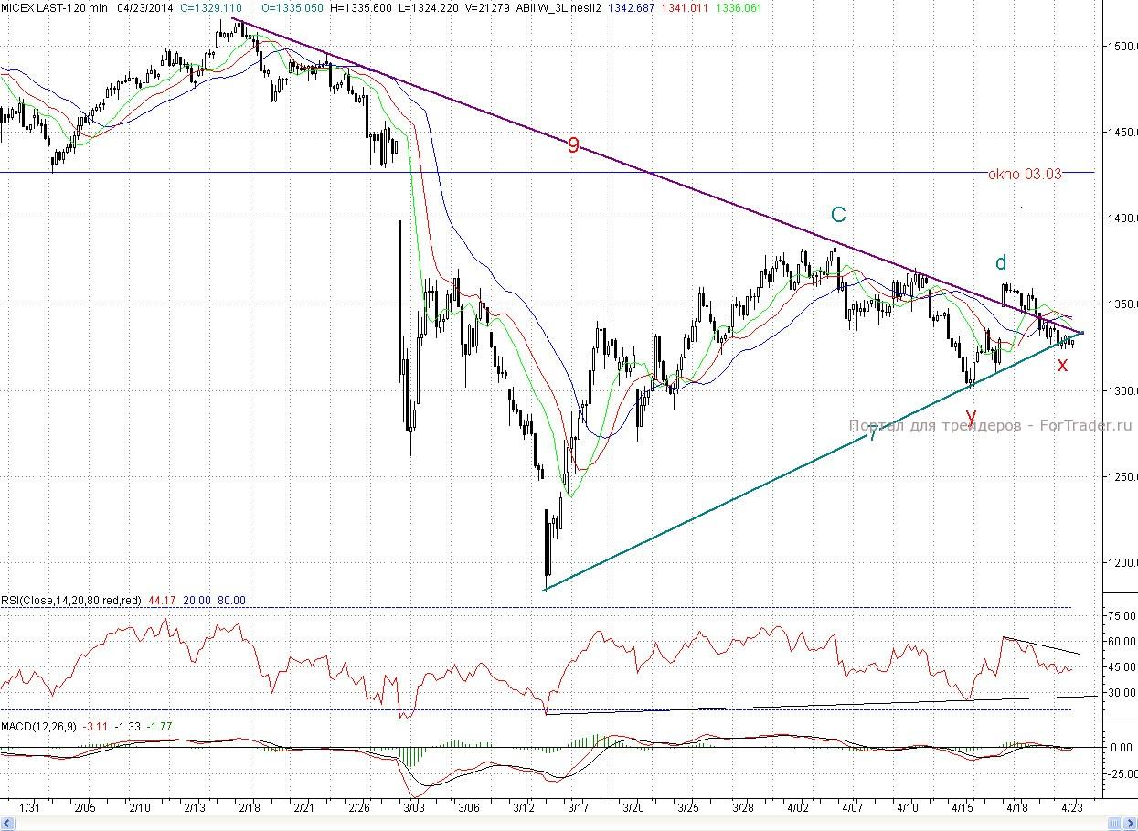 На сегодня ближайшей поддержкой выступит вчерашний минимум Х (1 324,22 п.) Ключевым редутом быков остается дневной фрактал на продажу У (1 300,76 п.) Роль ближайшего сопротивления сыграет среднесрочный падающий тренд (9) и вчерашний вечерний максимум (~1 333 п.). Ключевым рубежом медведей остается новый дневной фрактал на покупку d (1 362,46 п.)