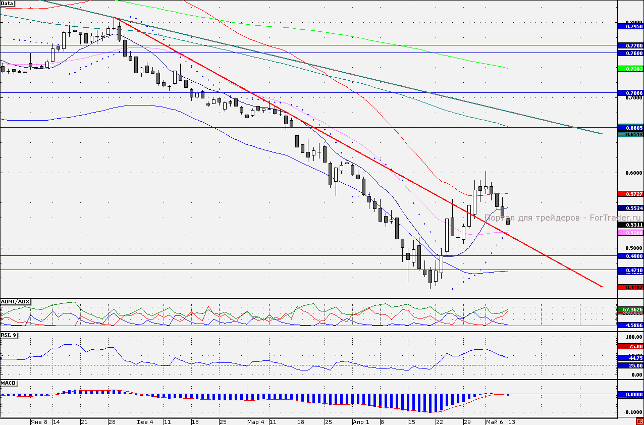 В лидерах падения сегодня числятся акции «РусГидро». В первой половине дня бумаги сверху вниз уже протестировали на прочность линию нисходящего тренда – 52,07 коп., действующего с конца января до конца апреля текущего года. Стоит отметить, что данная отметка усилена близостью прохождения 21- дневной скользящей средней. Таким образом, район 52,07 коп. является ключевым для «быков» и «медведей». Пока отметка 52,07 коп. удерживается еще есть шансы на формирование отскока вверх. Однако, судя по показаниям технических индикаторов, акции вновь могут вернуться в нисходящий тренд. Индикатор ADMI/ADX показывает, что преимущество сохраняется на стороне продавцов, линия «медведей» находится выше линии «быков», при этом гистограмма MACD (12;26;9) возобновила рост на отрицательной территории, что является позитивным сигналом для продавцов. Таким образом, от отметки 52,07 коп., в целях снижения риска, короткие позиции стоит сокращать и открывать новые при закреплении ниже данного уровня. Наш 30-минутный торговый робот открыл короткие позиции от отметки 55,56 коп.
