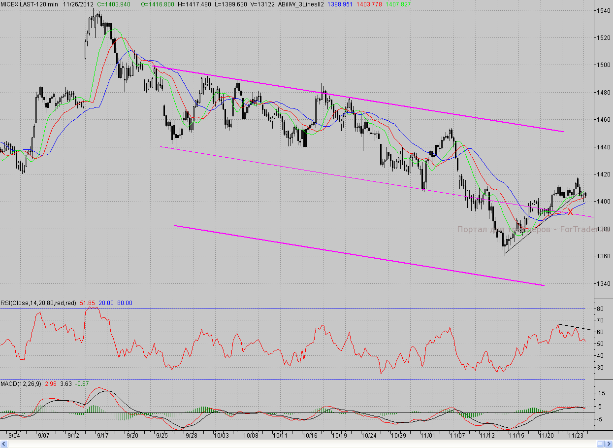 Исследуя 2-часовой график индекса ММВБ, видим, что на позитивном внешнем фоне котировки открылись с гэпом вверх и сразу оказались в районе ближайшего сопротивления в лице уровня 62%-ной коррекции от последней волны падения (~1418 п.) и незакрытого окна от 8 ноября. От данного рубежа «мишки» начали контратаку и к обеду сумели захватить ближайшую линию «бычьей» обороны, проходящую по краткосрочному растущему тренду. Ближе к окончанию торгов бурые сумели проколоть на пару пунктов и 2-часовой фрактал на продажу Х (1401,5 п.), Но развить свой успех не сумели, и день завершился в небольшом минусе.