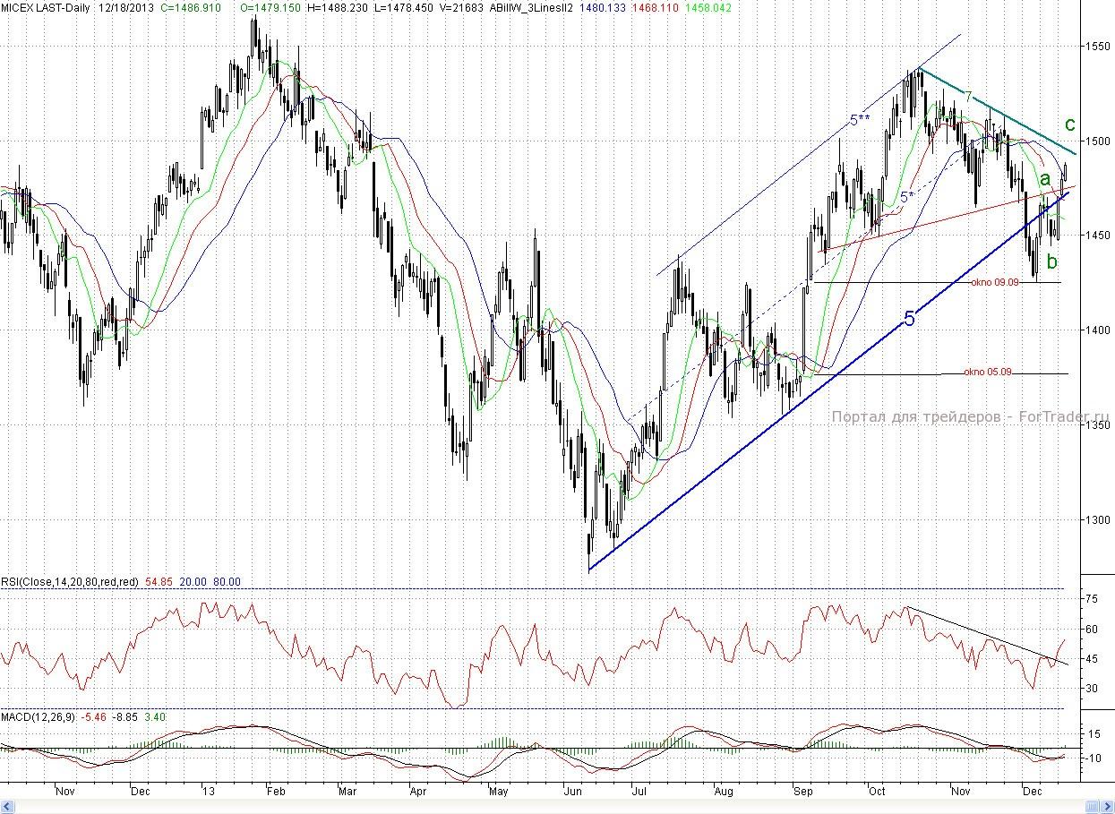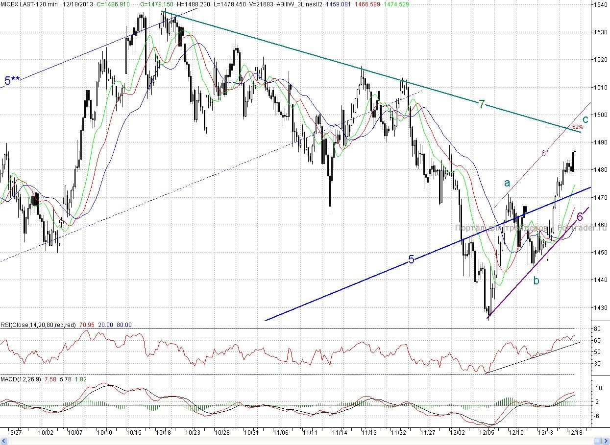 Исследуя 2-часовой график индекса ММВБ видим, что сразу с открытия котировки продолжили рост предыдущих двух дней. Но в районе ближайшего сопротивления (максимум среды (1 483 п.)) быки решили устроить перекур, и цены залегли в боковик. Однако ближе к окончанию торгов покупатели все же перешли к активным действиям, и котировки лишь немного не дотянули до первой цели растущей трехволновки a-b-c (~1 490 п.) В результате закрытие снова произошло в неплохом плюсе (0,51%)