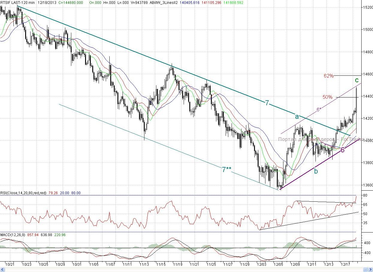 Таким образом, после очень важной победы в среду, покупатели продолжили наступление. Напомним, что в тот день быки сумели переломить негативную ситуацию и отменить сценарий продолжения падения с начала декабря. А сегодня на позитивном внешнем фоне цены сразу с открытия достигнут не только вышеобозначенной цели и преодолеют среднесрочный падающий тренд (7), но и доберутся до верхней границы краткосрочного растущего канала (6 -6*). Кстати на 2 — часовом графике фьючерса на индекс РТС котировки на вечерней сессии уже перебили цель роста трехволновки a-b-c (~144 000п.) и достигли верхней границы аналогичного канала. При этом вчерашние медвежьи дивергенции были сломаны. А на индексе ММВБ их и вовсе не было. Так что и техника играет за покупателей, и настроение у них будет очень позитивное. Правда ложкой дегтя в этой бычьей бочке меда может стать тот фактор, что рост в последние два дня происходит при уменьшающихся объемах. А это говорит о том, что полку покупателей не прибывает. Так что быкам надо держать ухо востро, ведь и медведи, хотя и упустили инициативу из своих лап, но еще очень сильны, да и среднесрочного слома понижающейся тенденции еще полностью не произошло.