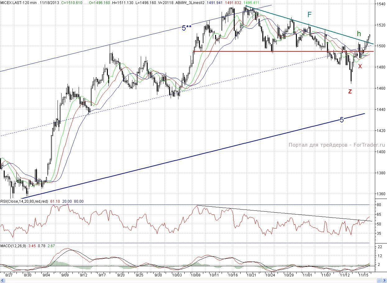 Исследуя 2-часовой график индекса ММВБ. видим, что на позитивном внешнем фоне, снова открывшись с гэпа вверх, котировки продолжили рост. Но в районе ключевого рубежа медвежьей обороны в лице верхней грани треугольника и 2- часового фрактала на покупку h (1 503,43 п.) цены встретили сопротивление. Тем не менее, быки были настроены очень решительно, и во второй половине торгов преодолели вышеназванный барьер. В результате день завершился почти на максимуме и в хорошем плюсе (1,13%)