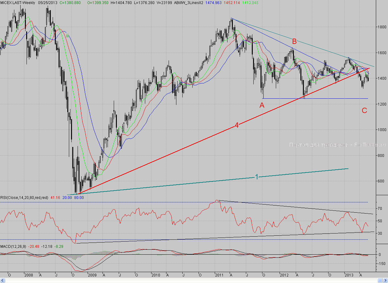 Соответственно, он наряду с линией (9*) и уровнем 62%-ной коррекции от всего отскока с 22 апреля будет основной поддержкой. И «быкам» необходимо во что бы то ни стало удержать данный редут, в противном случае «медведи» постараются возобновить среднесрочное падение с февраля этого года. И тогда мы можем увидеть не только тестирование годового минимума, но и снижение до района минимумов предыдущих трёх лет (1240-1250 пп.). Так что «быкам» есть за что биться. Ближайшей же поддержкой станет пятничный минимум (1376,3 п.).