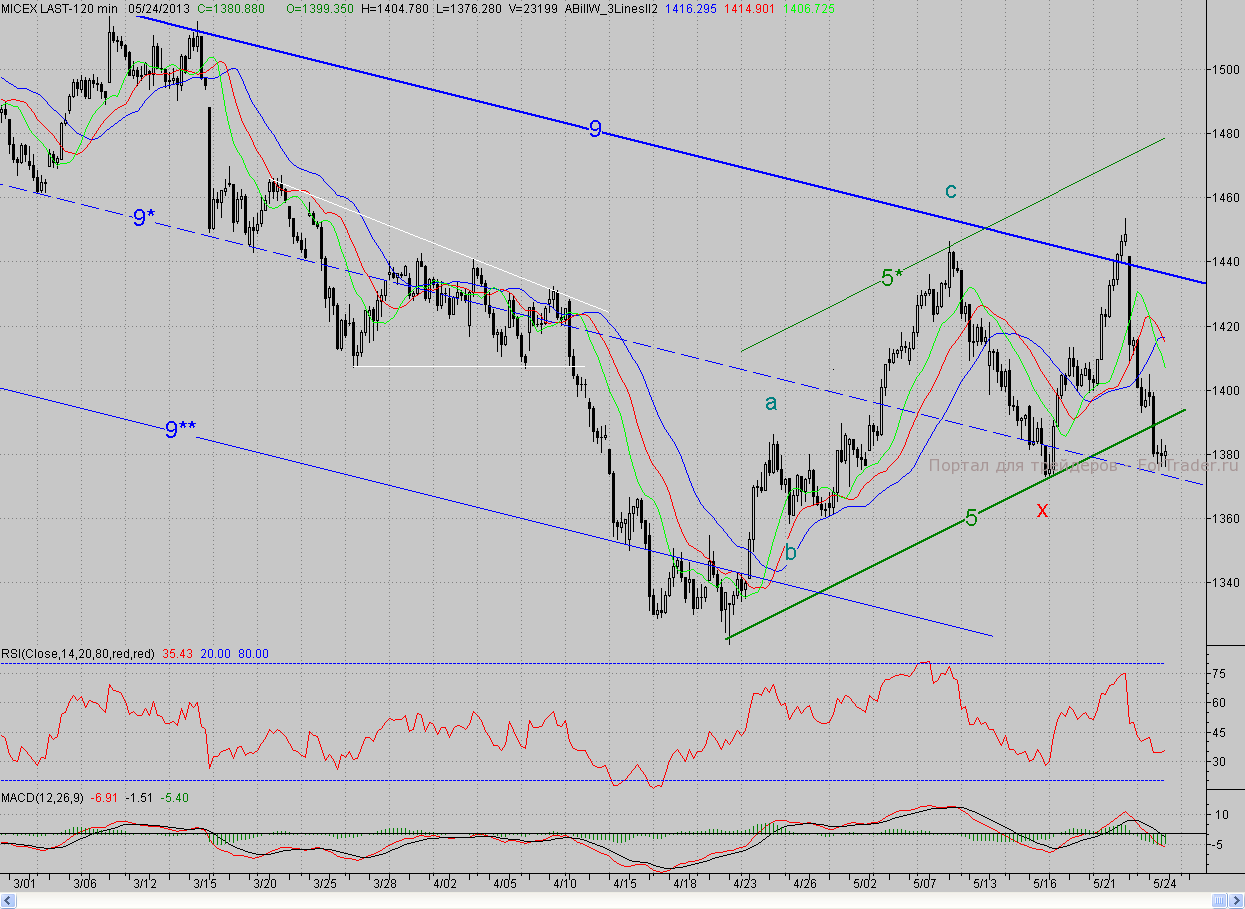 Исследуя 2-часовой график индекса ММВБ, видим, что открывшись с гэпом вверх, котировки попытались хотя бы частично отыграть большие потери предыдущего дня. Однако сил у «быков» явно не хватало, к тому же у «медведей» были другие планы. В результате уже через полчаса после начала торгов они возобновили давление. Какое-то время ближайшая поддержка в лице утреннего окна и минимума четверга противостояла натиску «бурых», но стоило мировому фону лишь немного ухудшиться, как продажи усилились, и котировки преодолели не только эту поддержку, но и более значимый редут в лице среднесрочного растущего тренда (5). Однако кластерная зона, в которой проходит средняя линия (9*) среднесрочного падающего канала (9-9**) и находится дневной фрактал на продажу Х (1372,6 п.), охладила пыл «мишек», и оставшуюся часть сессии цены провели вблизи данного района.