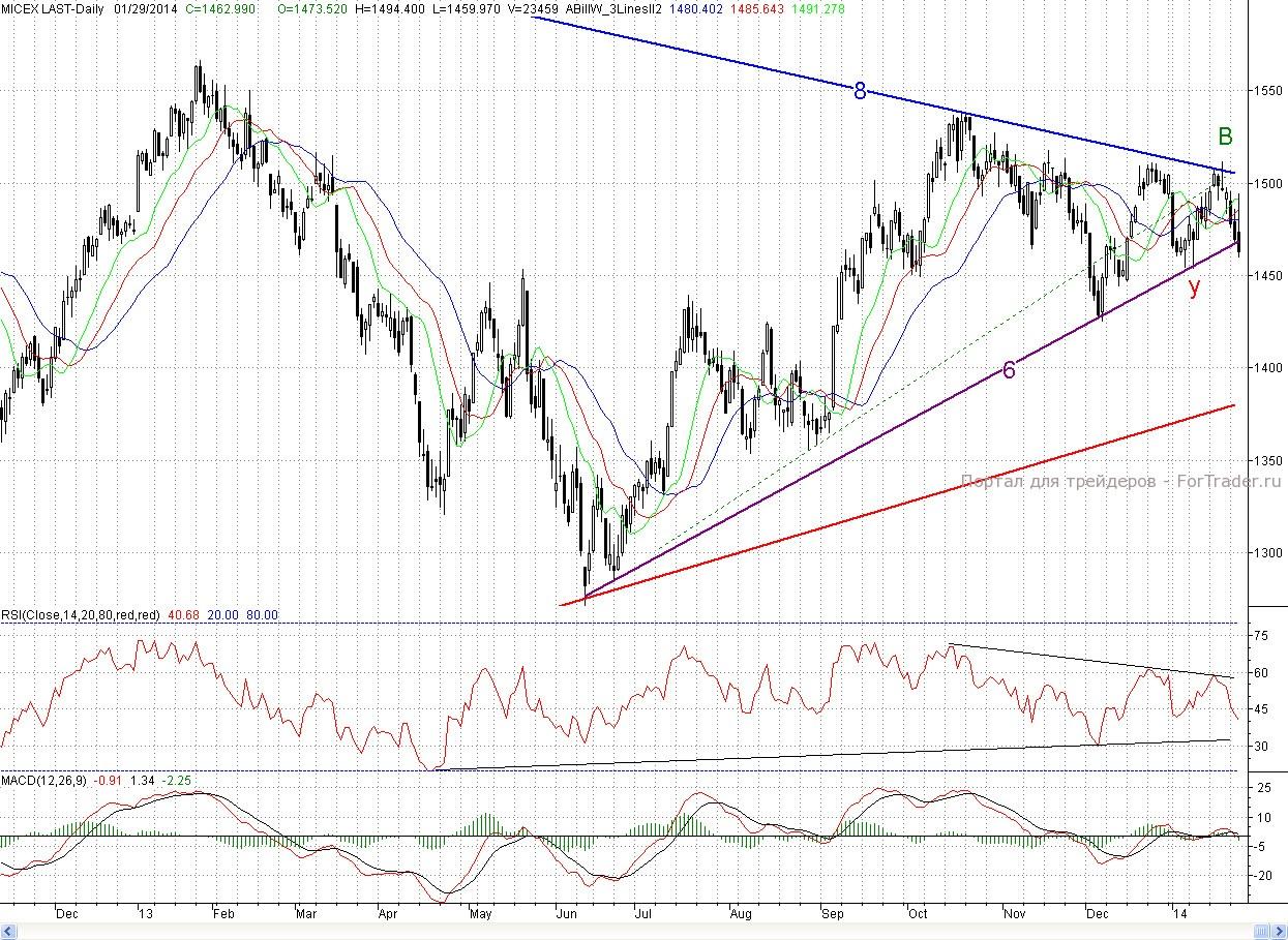Таким образом, покупатели в буквальном смысле слова подтвердили известную русскую пословицу «начали за здравие, а закончили за упокой», и тучи над их головами стали сгущаться. Тем не менее, с технической точки зрения на 2- часовом графике индекса ММВБ, и по RSI, и по обоим MACDам, наконец-то образовались бычьи дивергенции, но они еще пока потенциальные. Так что этот фактор, возможно, охладит медвежьи настроения. К тому же близость ключевой поддержки — дневной фрактал на продажу У (1 453,9 п.) должна придать уверенности покупателям. Поэтому вчерашнее преодоление среднесрочного растущего тренда (6) хотя и печальное событие, но не смертельное.